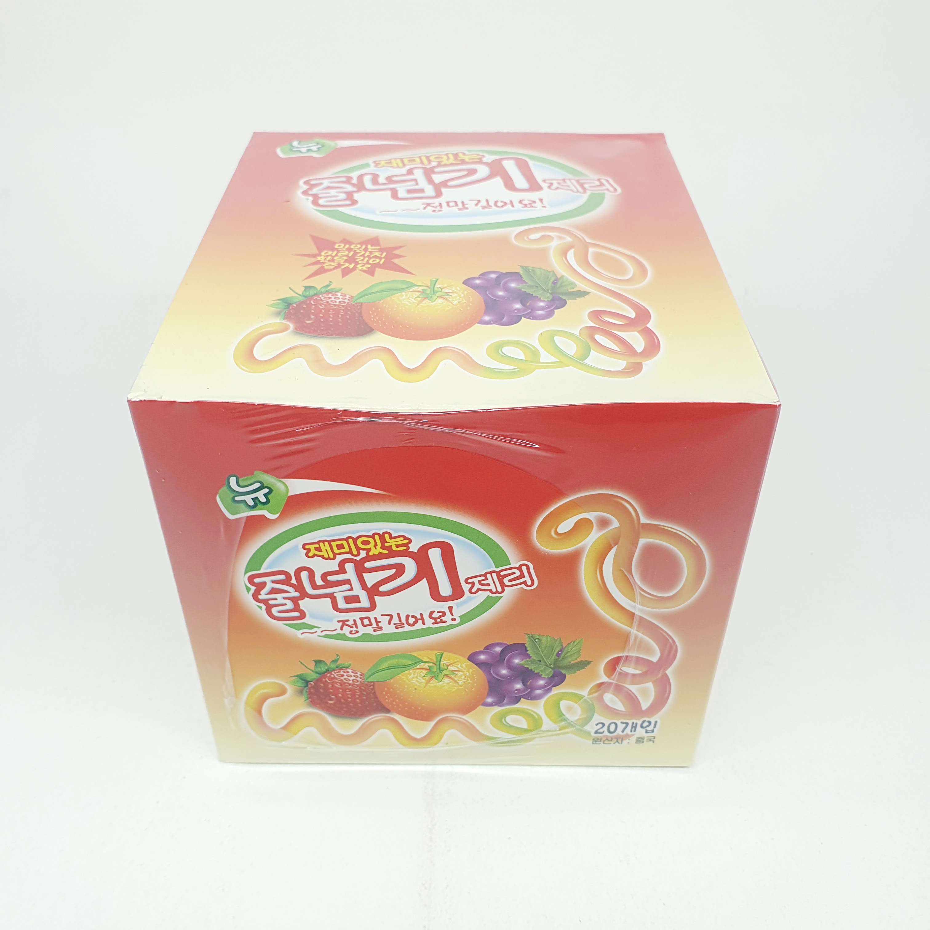 안녕하세요. 과자도매 닷컴의 세번째 상품 소개는 뉴 재미있는 줄넘기 제리입니다. 영양정보 총내용량 36g 130kcal 나트륨 15mg 1% 탄수화물 28g 9% 당류 20g 20% 트랜스지방 0g 콜레스테롤 0mg 0%지방0.3g 1%포화지방 0g 0% 단백질 4g 7% 제품명 뉴재미있는줄넘기제리 (합성딸기/포도/오렌지향 함유) 식품유형 캔디류 내용량 36g(130kcal) 원산지 중국 제조사 광동유카식품유한공사 수입원 및 소재지 (주)소담인터내셔널 T(02)914-9939 서울시성북구장월로5길4,1층 원재료명 설탕 포도당시럽 젤라틴(돼지고기) 포도당 DL-사과산 구연산나트륨 과일쥬스0.3%[(고형분60%)딸기/포도/오렌지] 구연산 팜유 합성향료(딸기/포도/오렌지향) 착색료(식용색소황색제4호,식용색소청..