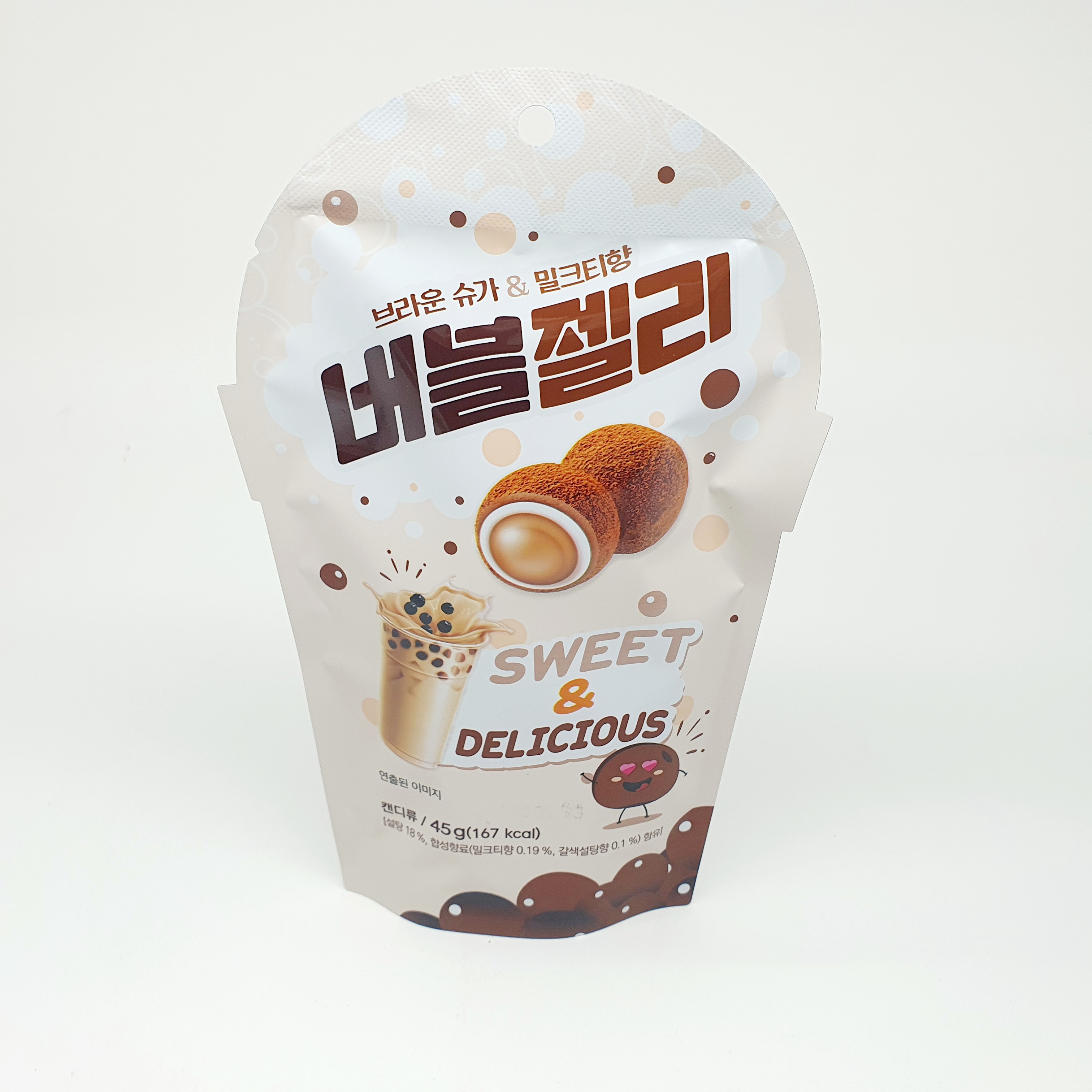 오늘은 새롭고 매력적인 맛을 내는 버블젤리를 소개해 드리려고 합니다.^^ 제품명: 브라운 슈가 밀크티향 버블젤리 [설탕 18%, 합성향료(밀크티향 0.19%, 갈색설탕향 0.1%) 함유] 식품유형: 캔디류 원산지 중국 제조사" GUANGDONG HAOLIYUAN FOOD CO.,LTD. 내용량: 45g(열량 : 167 kcal) 수입 업소명 : (주)대경인터내셔널(TEL.031-593-8117) 경기도 남양주시 별내중앙로 30(별내동) 별내로데오몰 305-518원재료명: 포도당시럽, 식물성크림(포도당시럽, 경화팜유, 카제인나트륨, 글리 세린지방산에스테르, 제이인산칼륨, 이산화규소, 합성향료(계란향, 우유향 0.02%)), 설탕 18%, 유청분말 10 %, 카라기난, 아라비아검 코코아분말, 합성향료(밀크티..