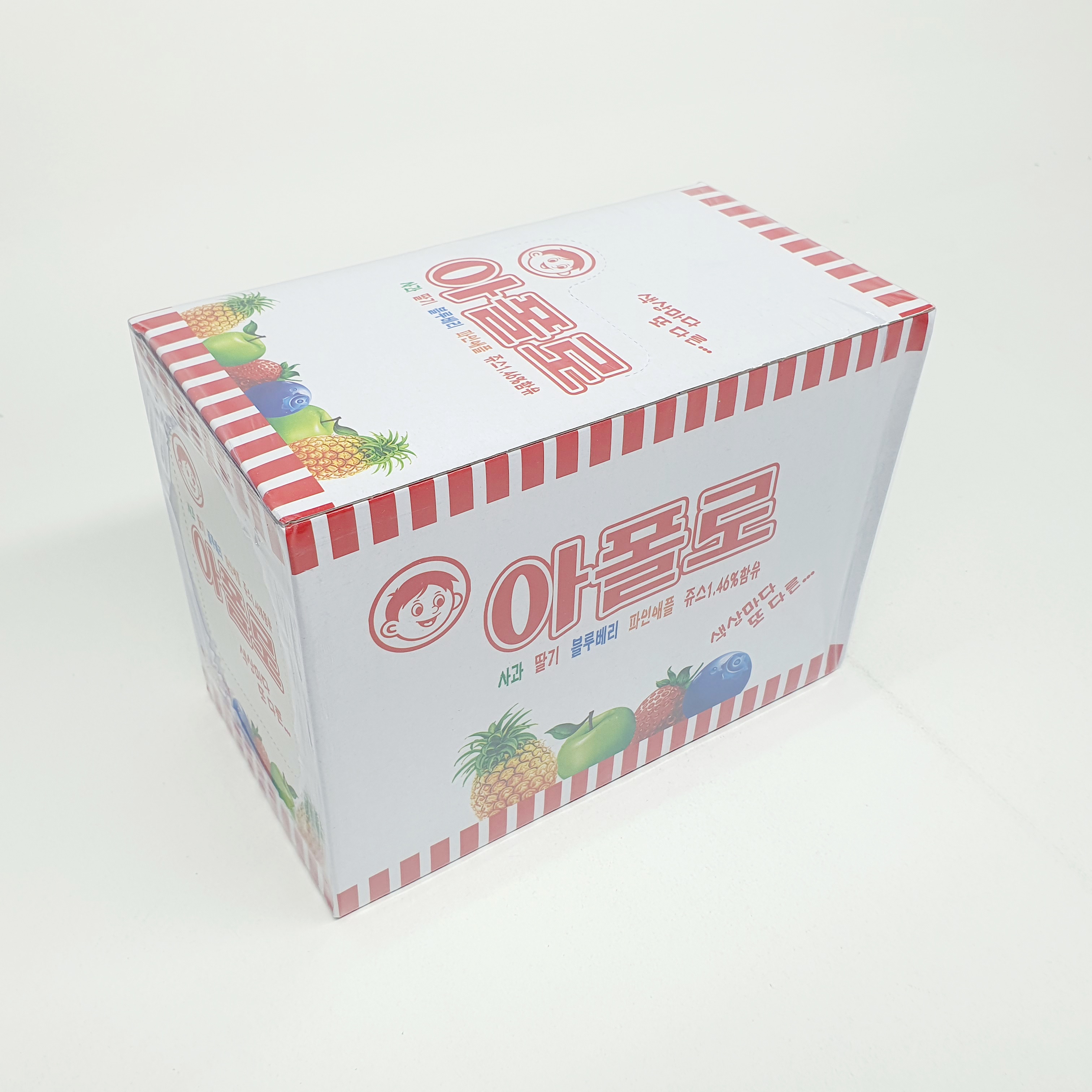 안녕하세요.과자도매 닷컴의 첫번째 소개 상품은 추억의 과자 아폴로입니다. 아폴로의 원재료는포도당,설탕,덱스트린,구연산,과일쥬스 1.46%[고형분60%(딸기/블루베리/사과/파인애플)]합성향료(딸기/블루베리/사과/파인애플향)젤라틴(돼지코기) DL - 사과산착색료(식용색소황색제4호,식용색소적색제40호,식용색소청색제1호)돼지고기 함유입니다. 과자도매 닷컴에서는 정확한 정보 전달을 위해, 포장재질과 제조사 정보까지 알려 드립니다. 포장재질은 폴리프로필렌에 폴리에틸렌 빨대를 사용하였습니다. 영양정보는1봉지(36g)당 1일 영양성분 기준치에 대한 비율로나트륨 0mg, 탄수화물 35g, 지방 0g, 트랜스지방 0g, 포화지방 0g, 콜레스테롤 0mg, 단백질 0g입니다. 아폴로 원산지는 중국이며 제조사는 광동백성식..