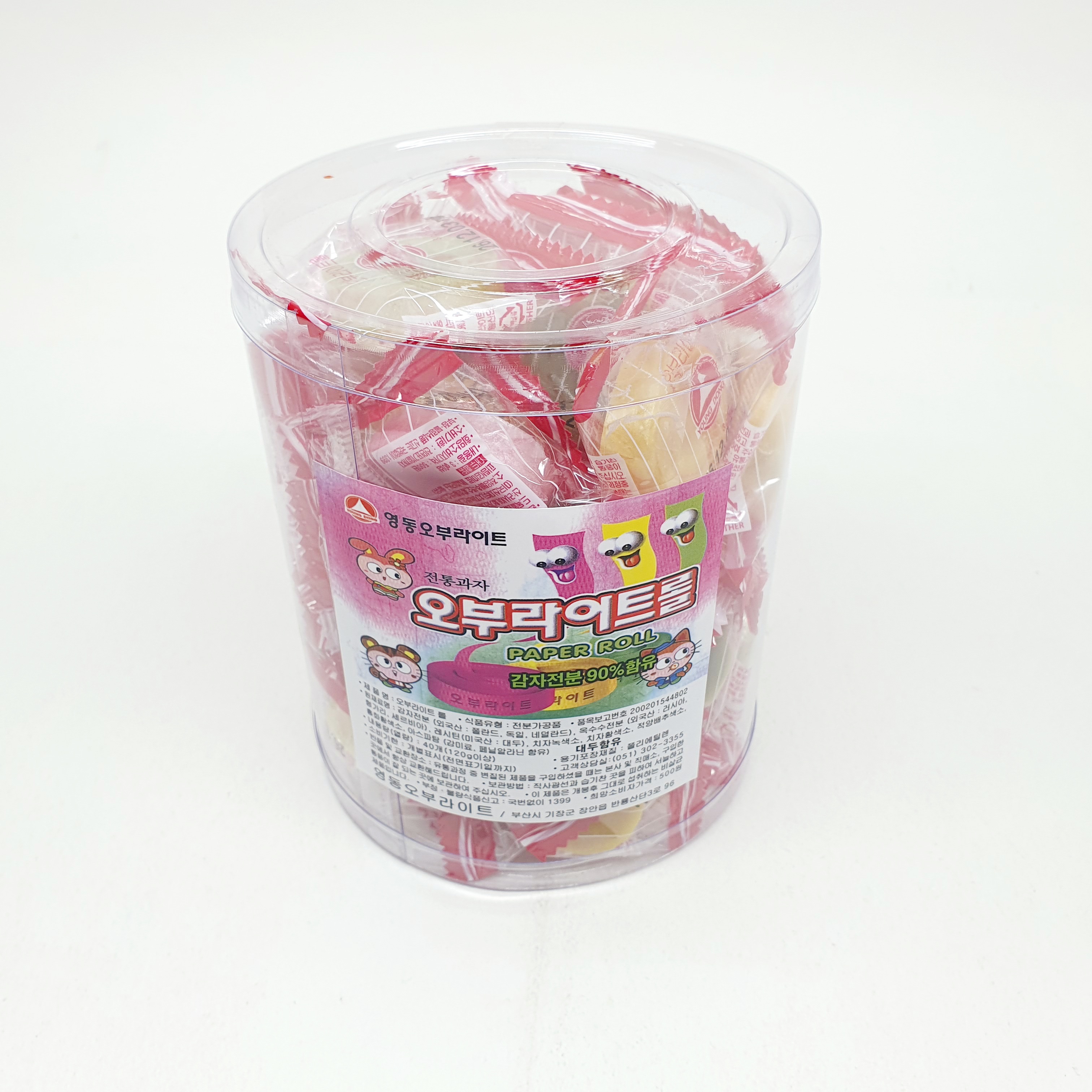 오늘은 감자전분을 이용한 페이퍼 롤 추억의 과자 오브라이트롤을 소개해 드립니다. 감자전분 90%함유 제품명 : 오부라이트 롤 식품유형 : 전분가공품 •품목보고번호 200201544802 원재료명: 감자전분 (외국산: 폴란드, 독일, 네덜란드), 옥수수전분 (외국산: 러시아, 헝가리, 세르비아), 레시틴(미국산 대두), 치자녹색소, 치자황색소, 적양배추색소,홍화황색소, 아스파탐 (감미료, 페닐알라닌 함유) 대두함유 내용량(열량) : 40개(120g이상) 용기포장재질 : 폴리에틸렌고객상담실: (051) 302-3355제조사 : 영동오부라이트 부산시 기장군 장안읍 반룡산단3로 96 상품은 3가지 색상으로 구성되어 있으며, 폴리에틸렌으로 잘 포장되어 있습니다. 감자전분을 얇게 롤 페이퍼로 만든 오부라이트롤은..