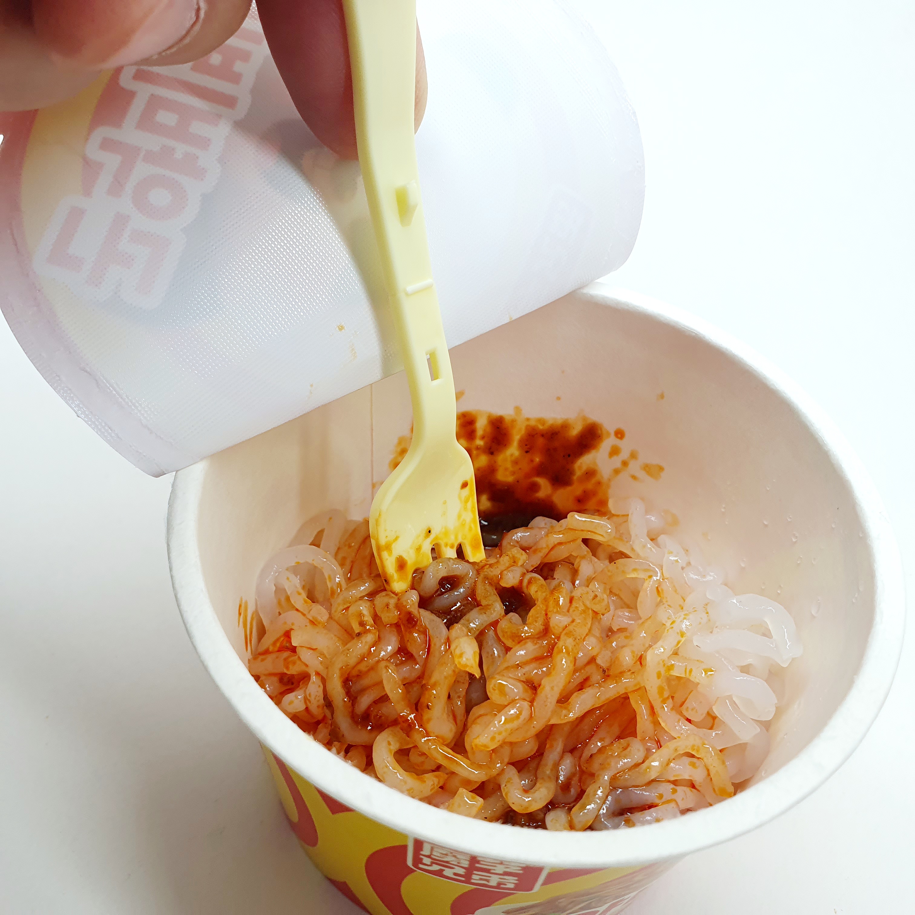 포크를 조립하여, 곤약면과 액상스프를 골고루 맛있게 비벼주세요.