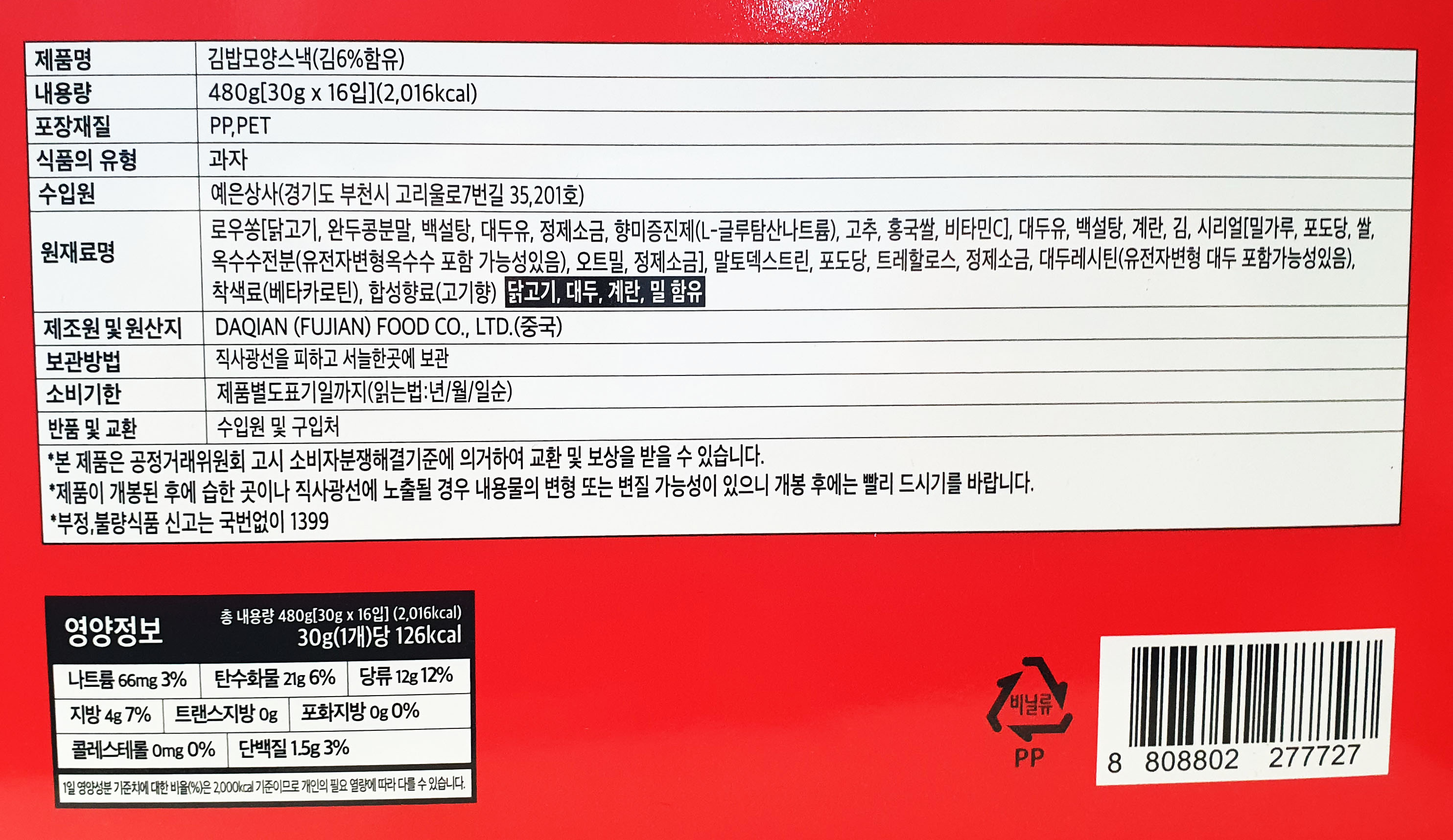 - 제품명: 김밥모양스낵(김 6% 함유)