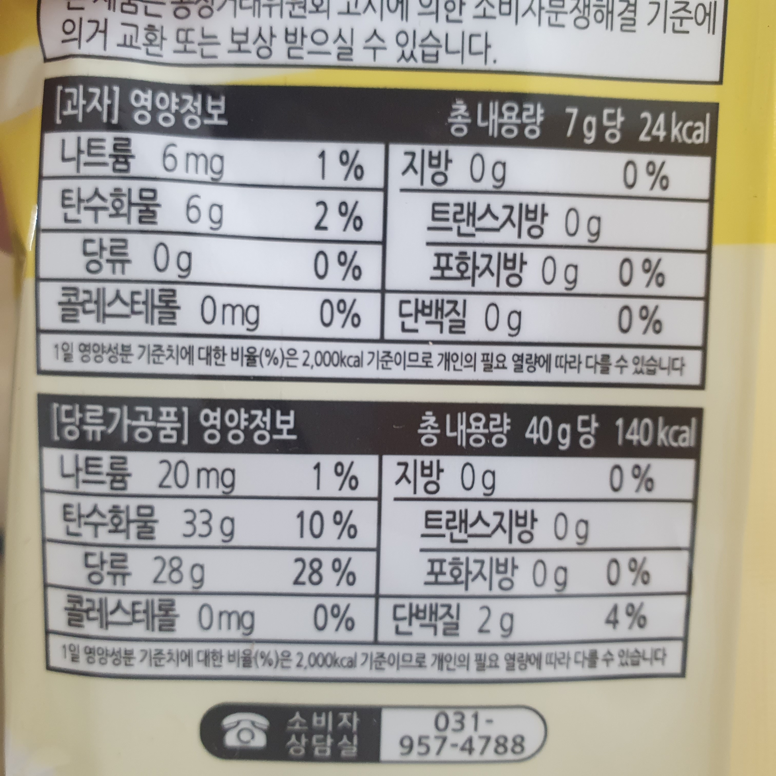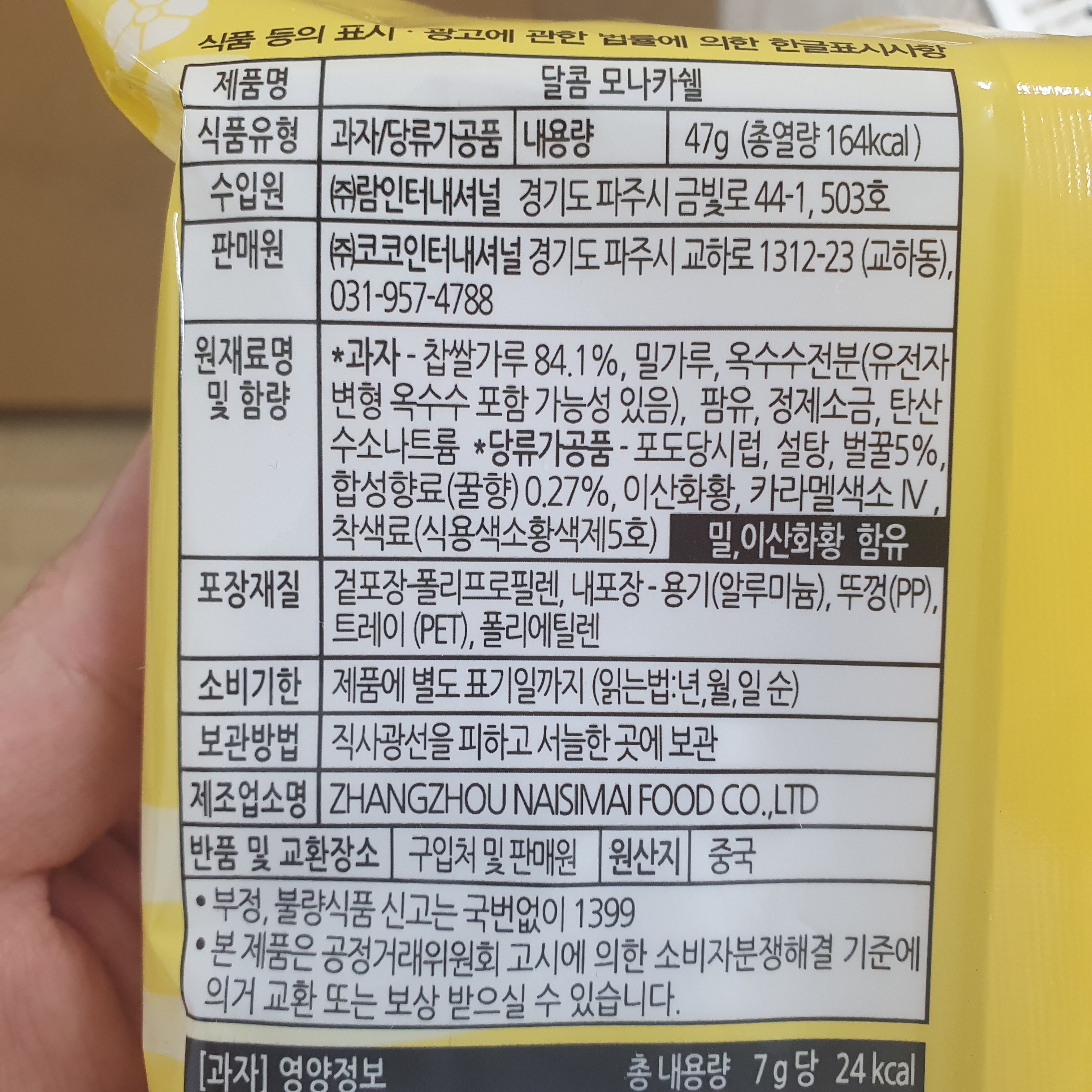 - [과자] 찹쌀가루 84.1%, 밀가루, 옥수수전분(유전자 변형 가능성 있음), 팜유, 정제소금, 탄산수소나트륨