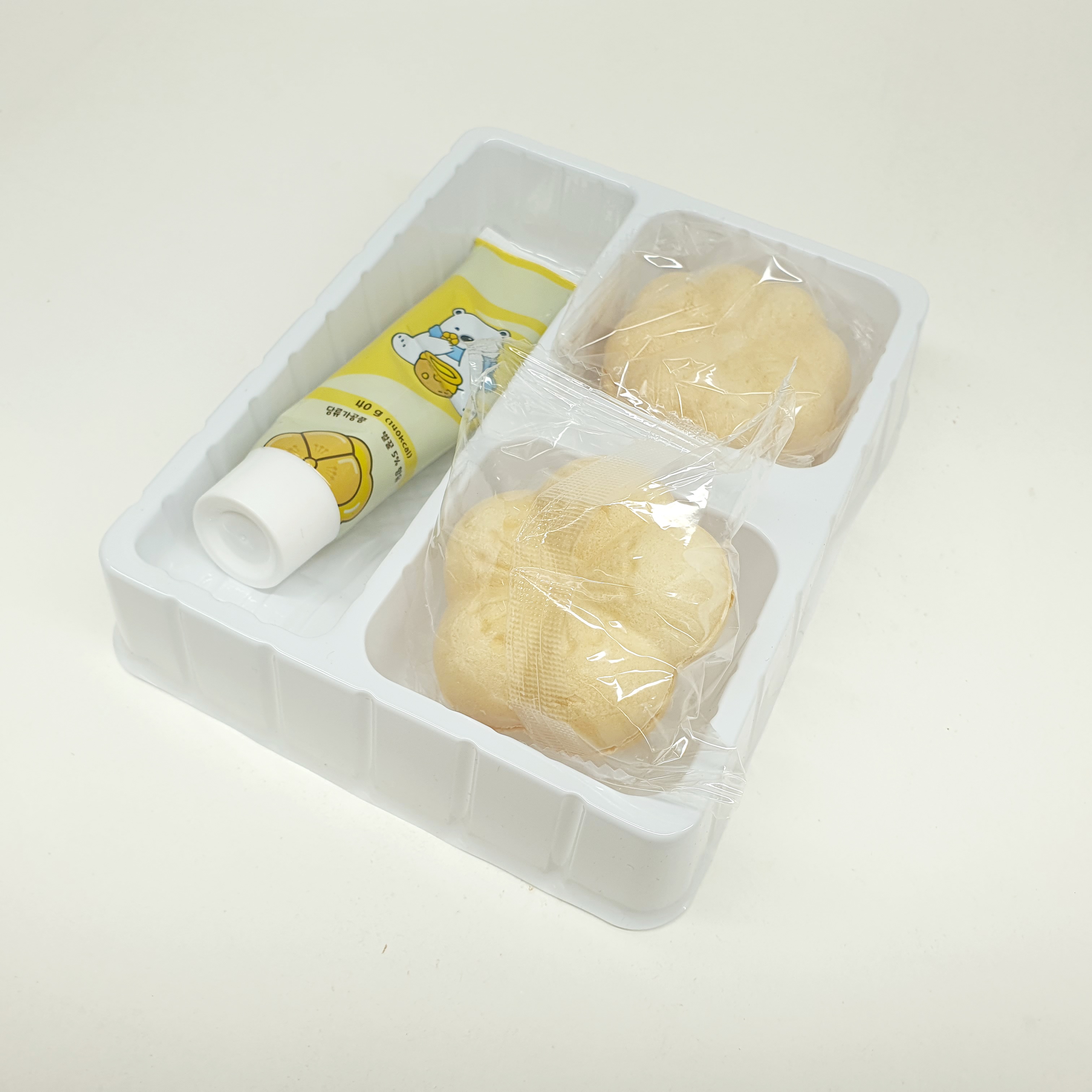 그 안에는 꿀 튜브 1개와 벚꽃 모양의 과자 2개가 들어있어요.