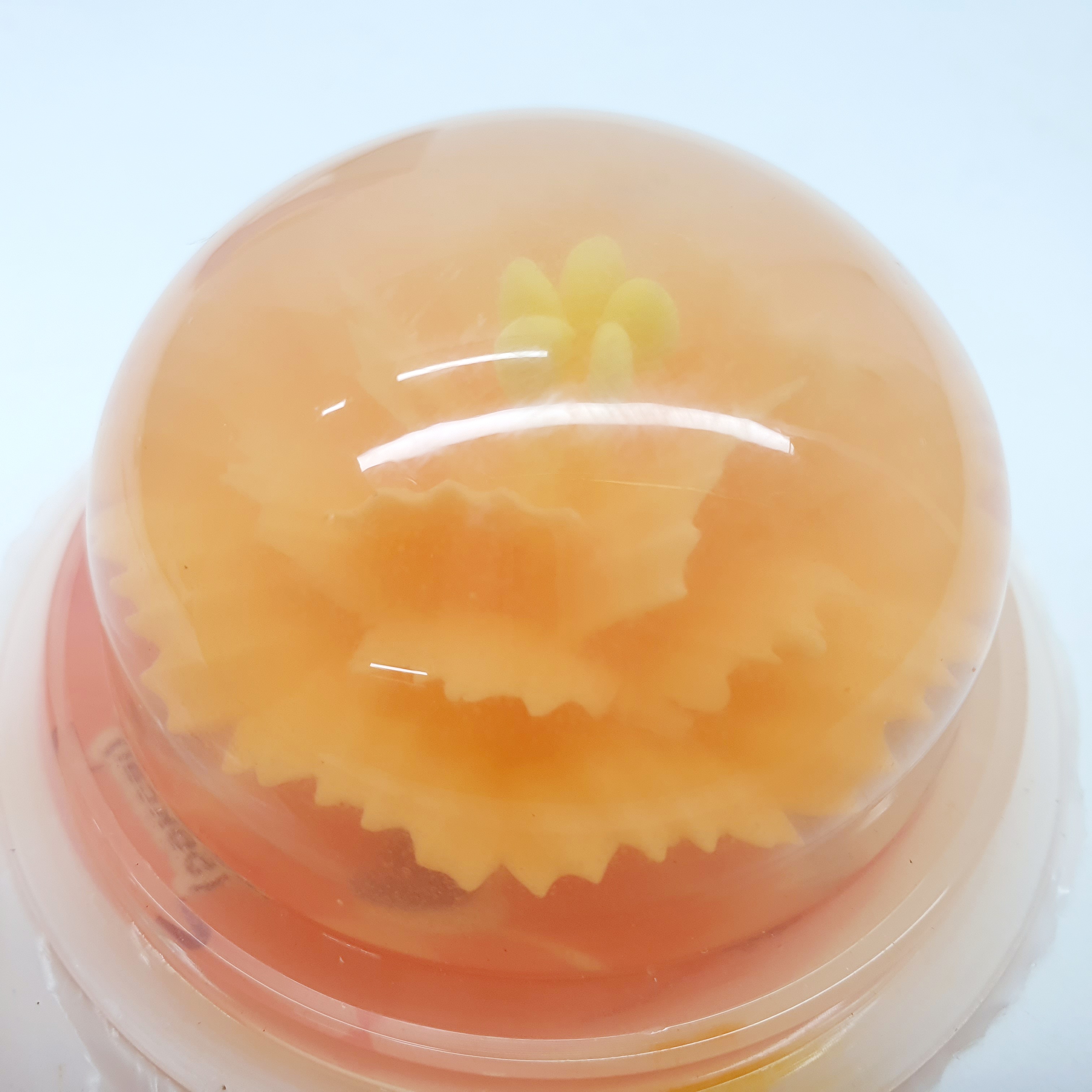 이 제품의 가장 큰 특징은 젤 안에 피어난 꽃 모양이에요. 꽃잎이 굉장히 사실적으로 표현되어 있어서, 마치 투명한 젤리 속에 꽃이 한 송이 담겨 있는 것 같아요. 전시될 때도 일부러 꽃 모양이 보이도록 뒤집어 두는데, 이 덕분에 선물용으로 받으면 기분이 좋아지는 디자인이에요.