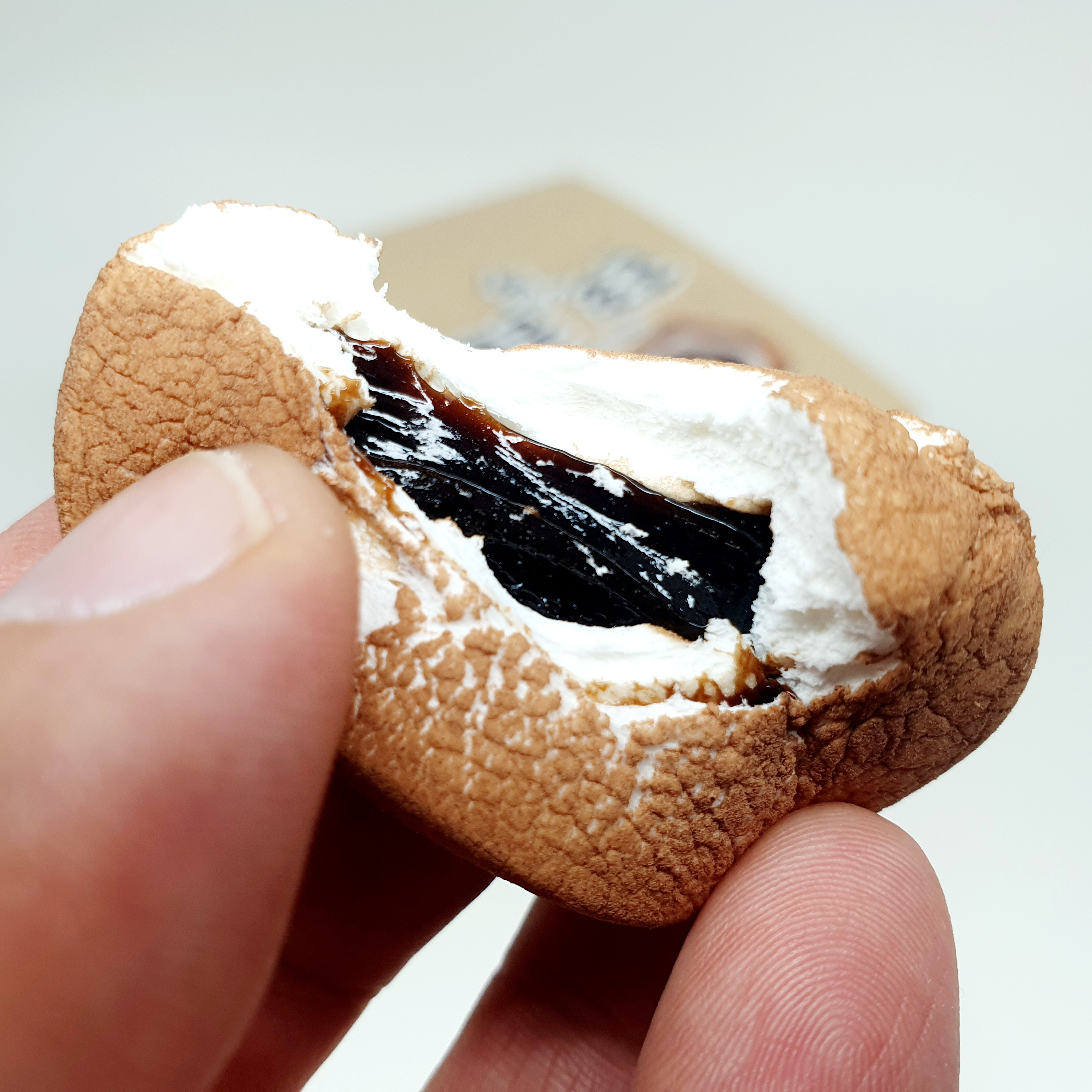 입안에 넣으면, 가볍고 말랑말랑한 마시멜로가 초코가루 향과 달콤한 초코잼이 어우려져 금새 녹습니다.