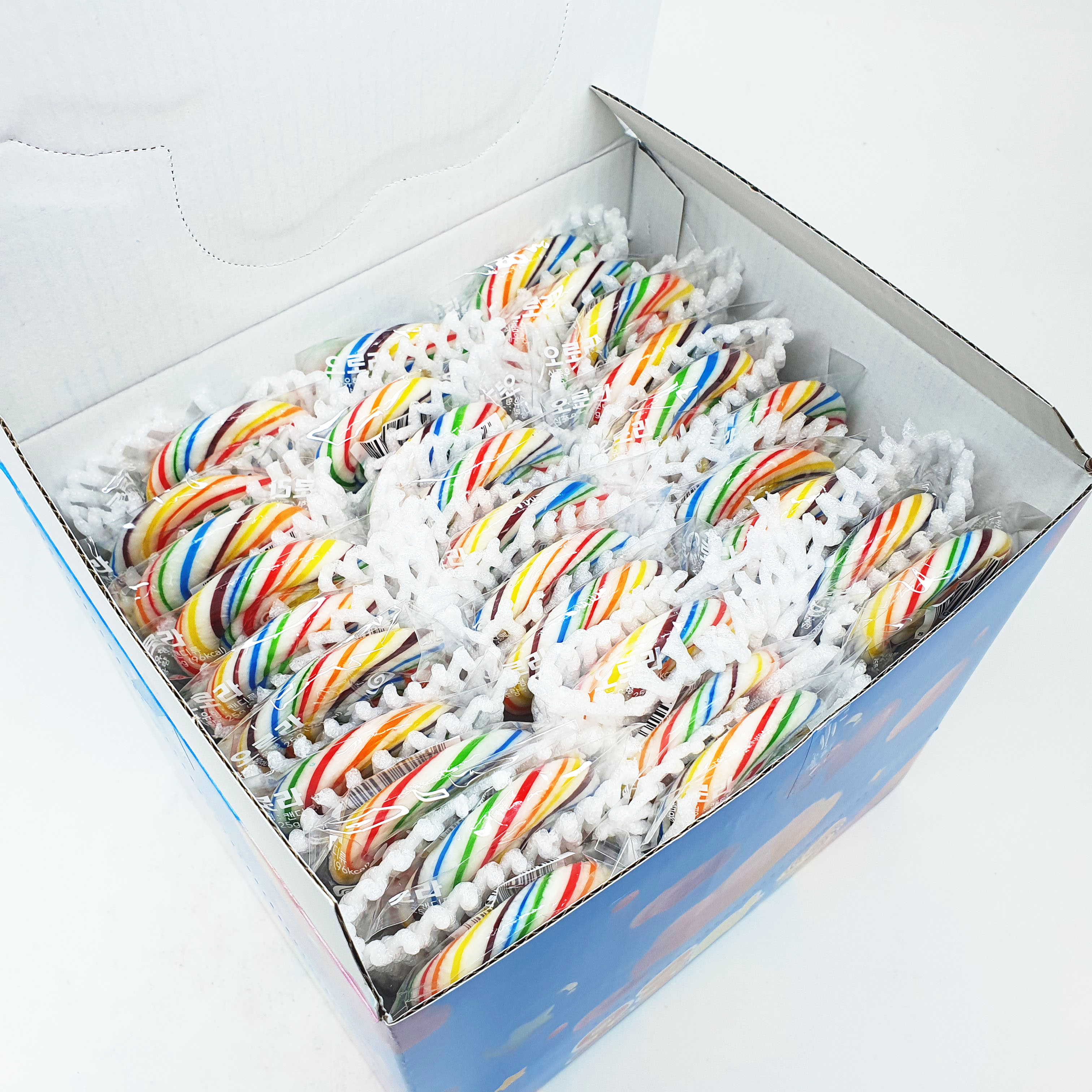오로라 캔디는 진열 박스 안에 꼬치 형태로 꽂혀 있는 구성이라