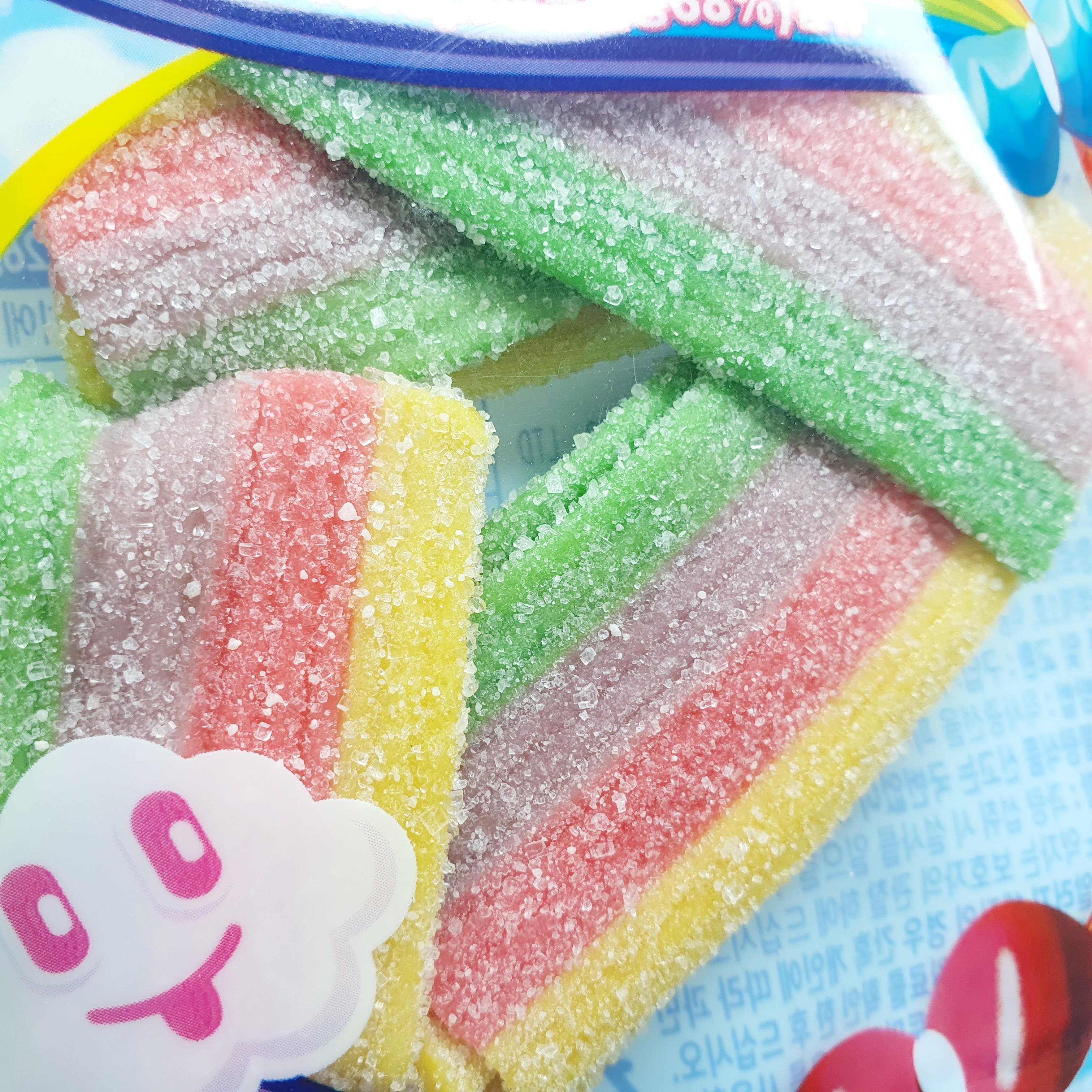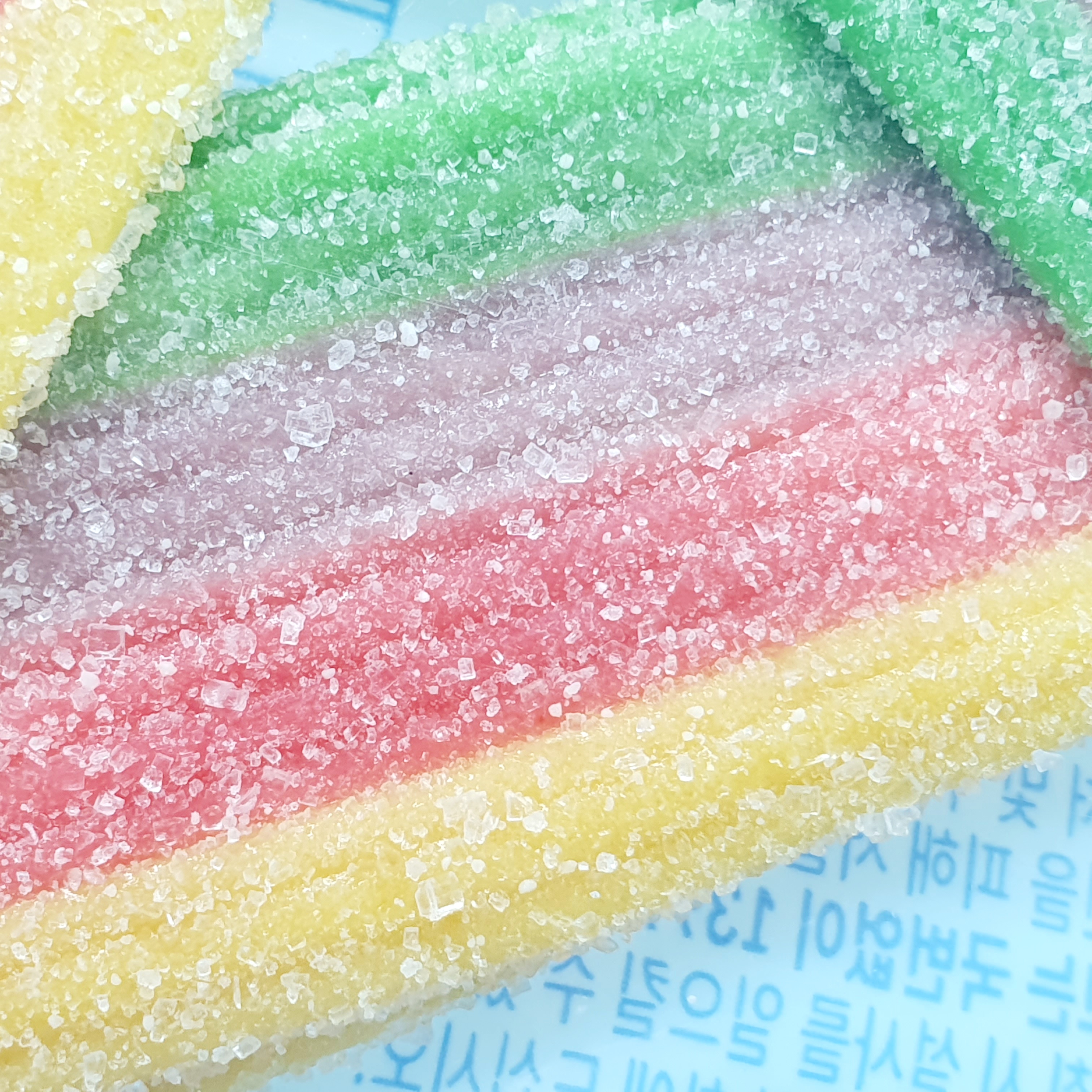 노랑, 빨강, 갈색, 연두색으로 이어지는 줄무늬는 마치 무지개 리본을 그대로 젤리로 만든 듯!