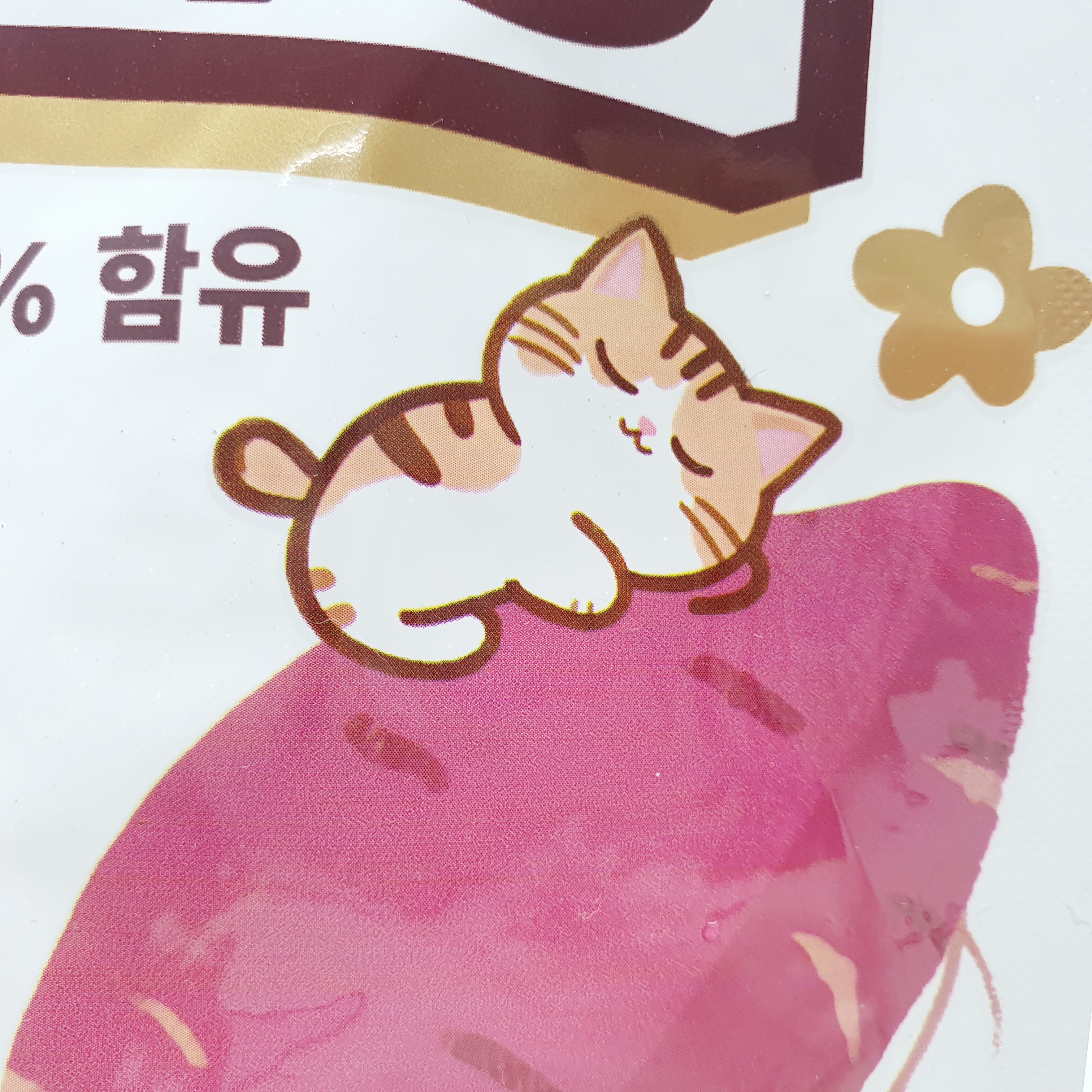 고구마를 껴안고 자는 고양이 캐릭터가 그려져 있어요.