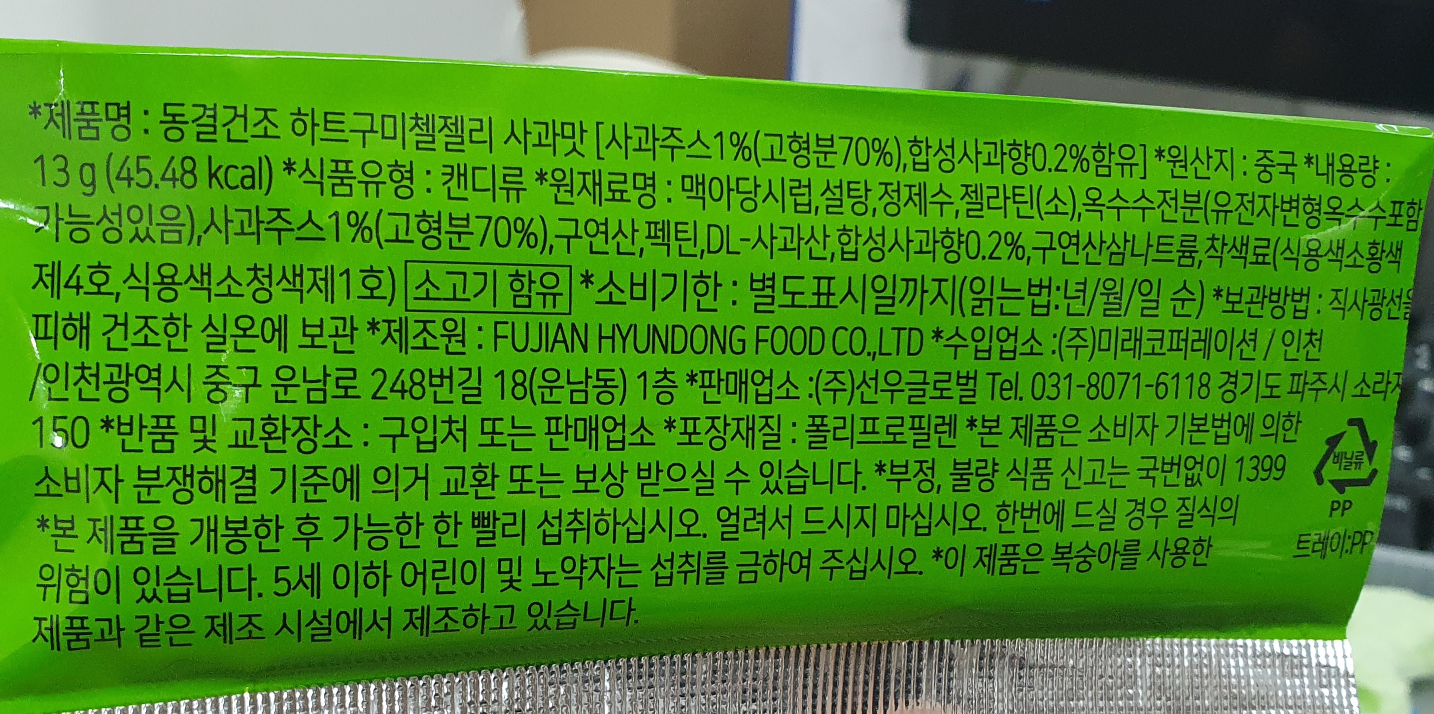 • 첨가물: 구연산, 펙틴, DL-사과산, 구연산삼나트륨, 합성사과향(0.2%), 착색료(황색 제4호, 청색 제1호)