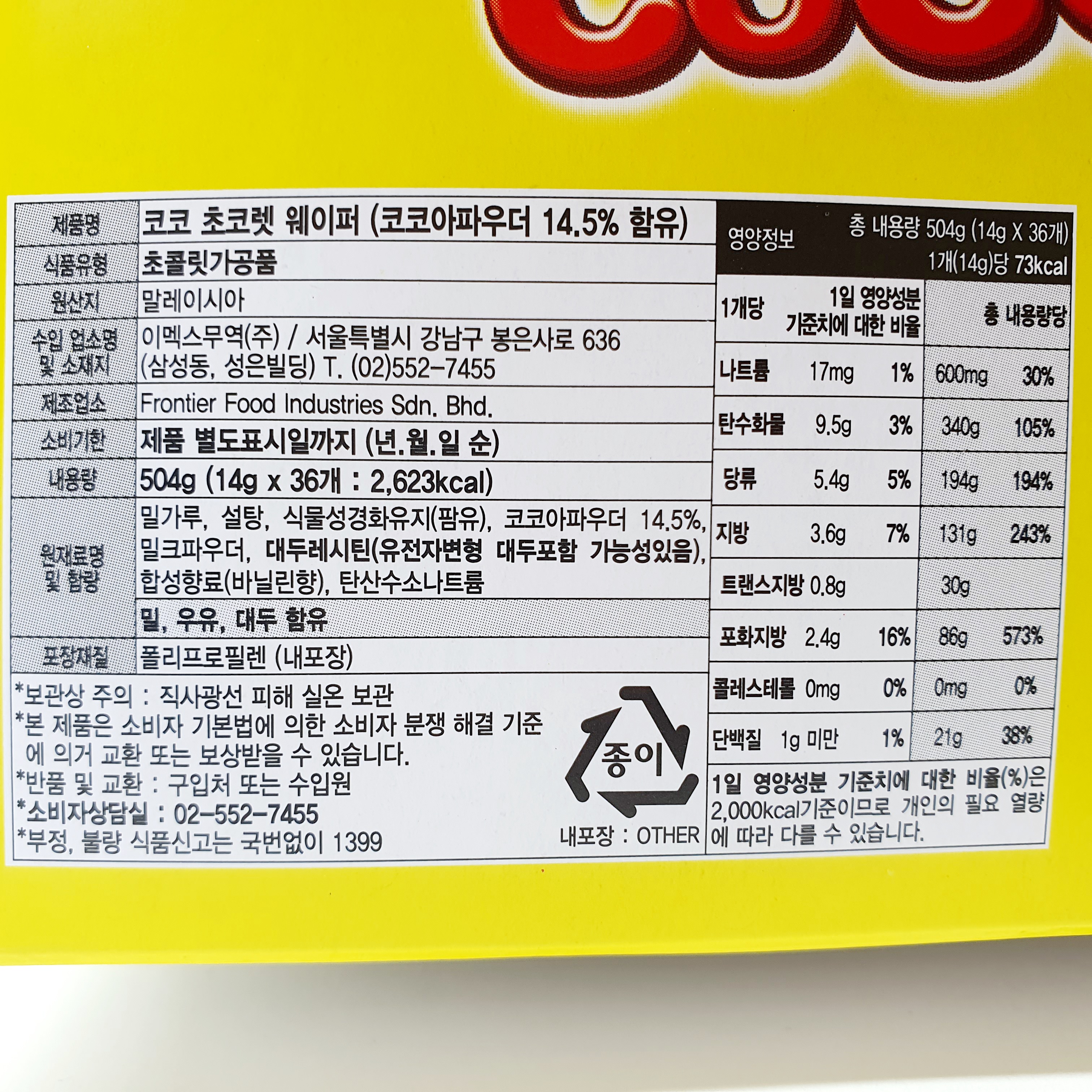 영양정보: 총 내용량 504g (14g X 36개) 1개(14g)당 73kcal