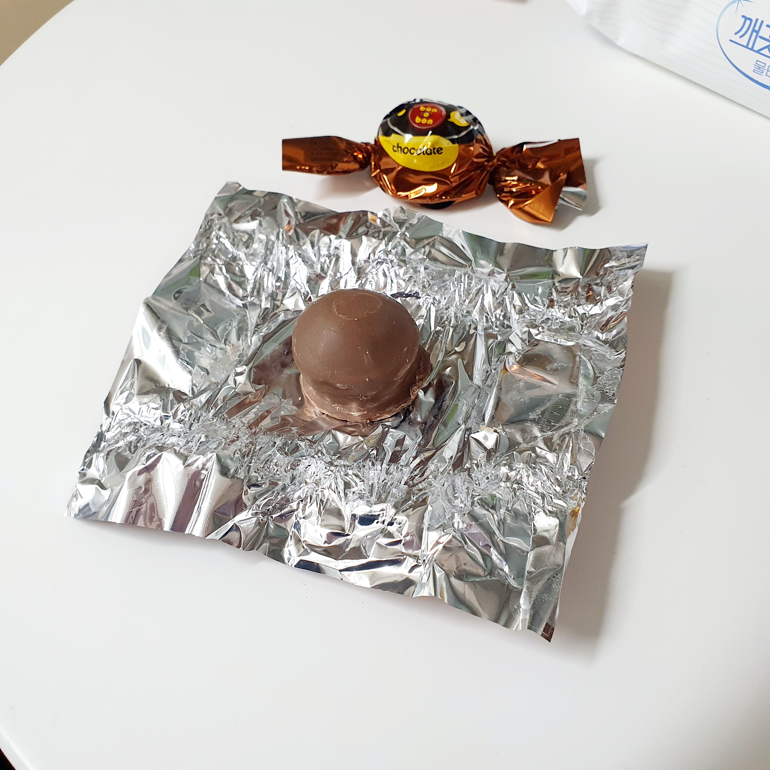 포장지를 열어보면 둥금 본오본 초콜릿 1개가 들어있어요. 입이 크다면 한입에 들어갈 크기지만 부담이 되네요~