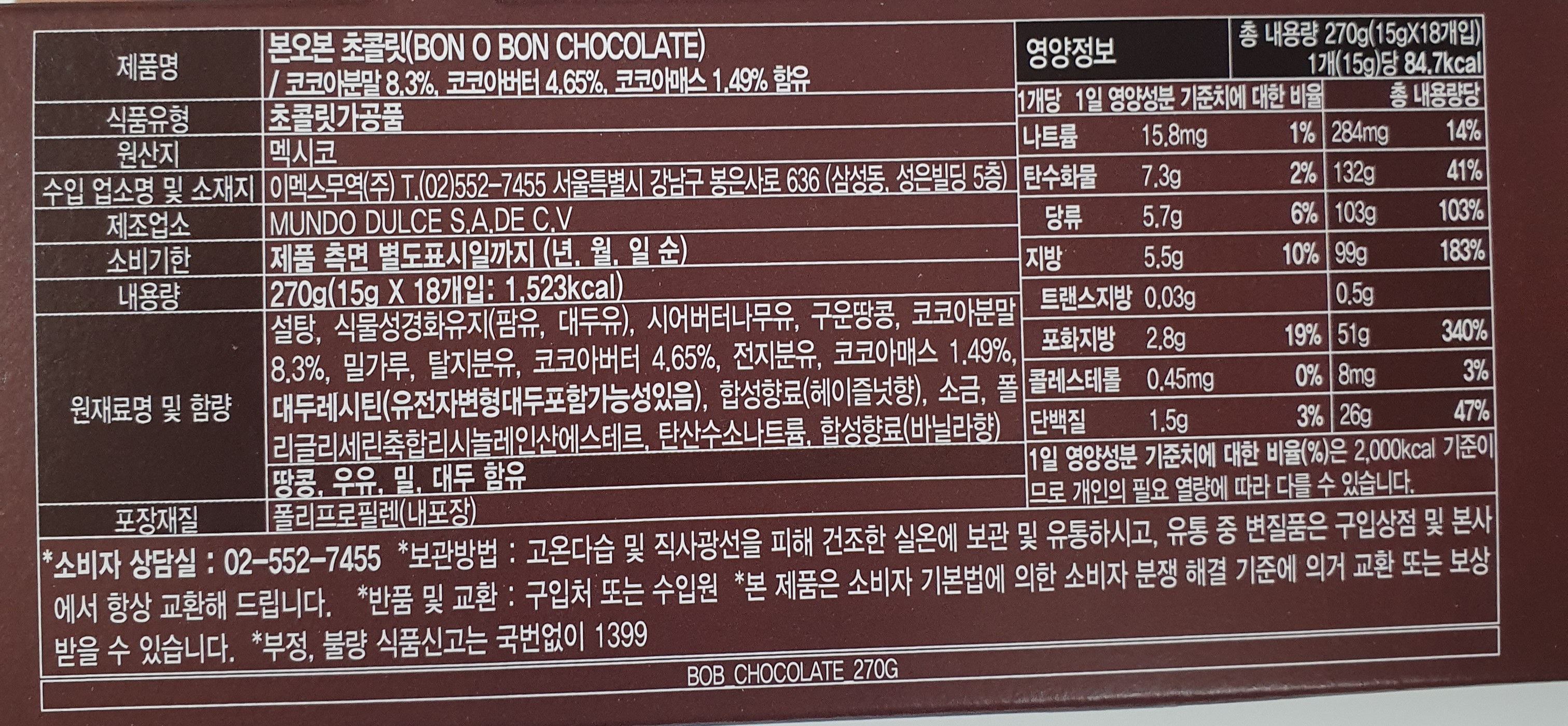 상자안에는 15g의 본오본 초콜릿 18개가 들어있어요.