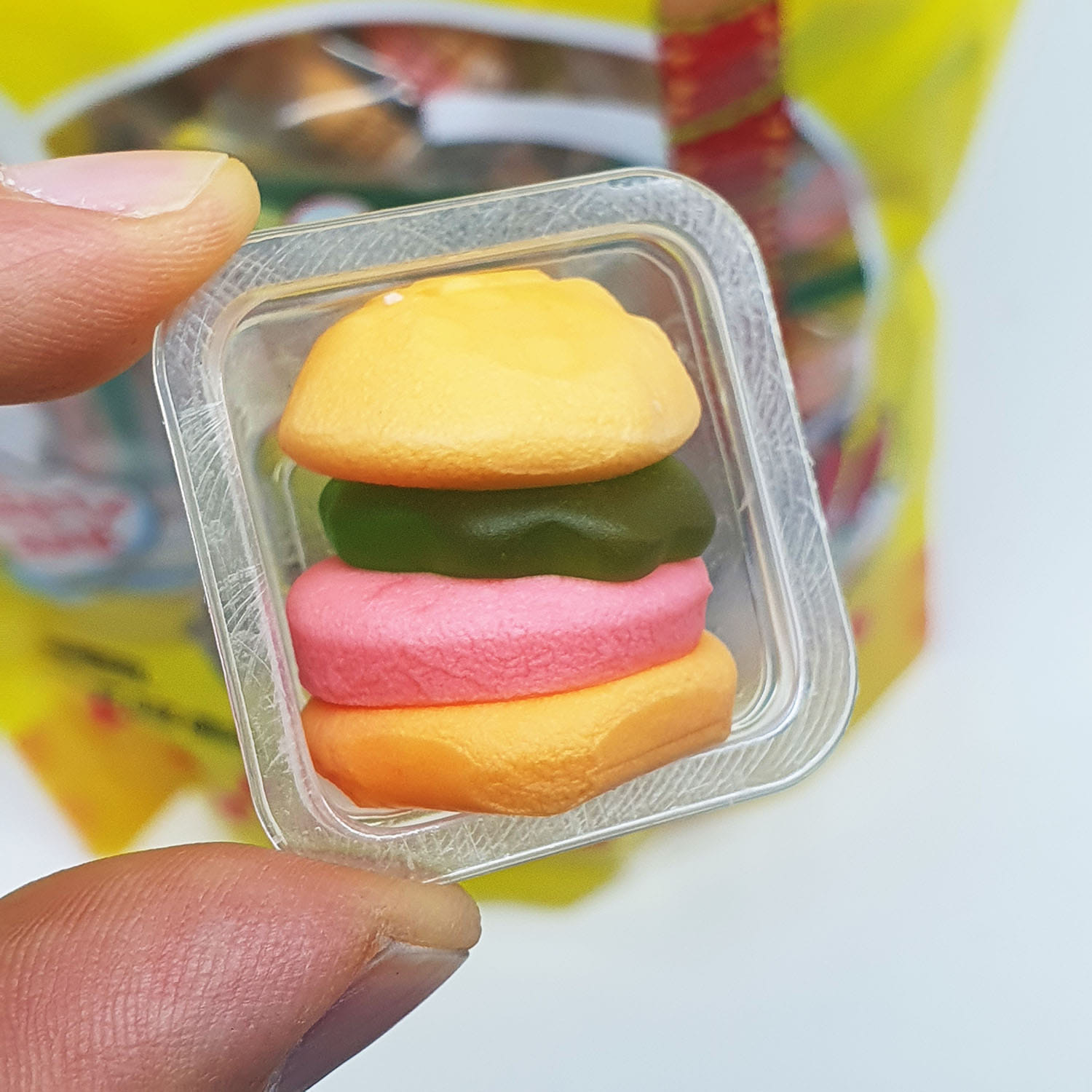 - 모양 보존: 플라스틱 트레이에 담겨 있어 젤리가 눌리거나 뭉개지지 않고 예쁜 햄버거 모양을 유지하고 있답니다.
