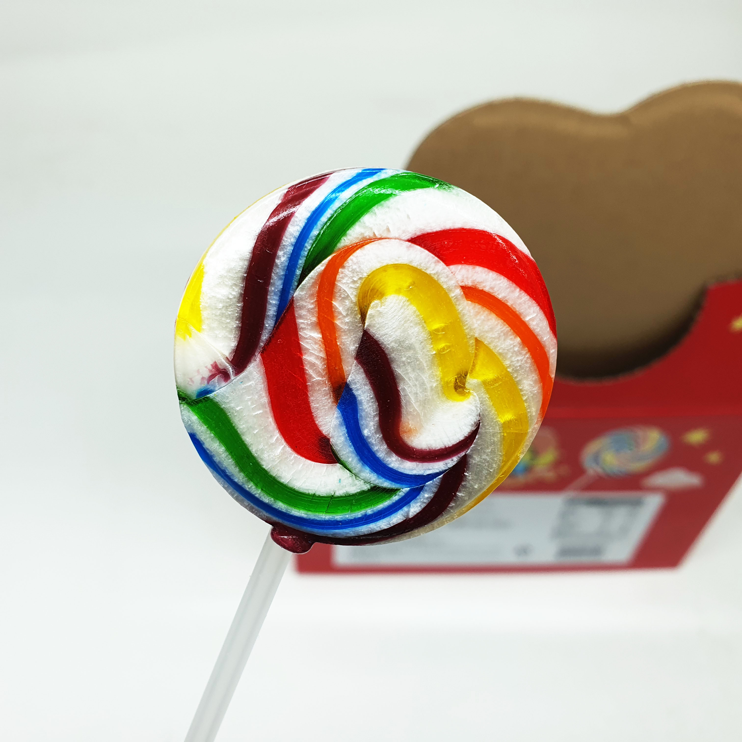 빨강, 노랑, 파랑 등 무지개 색상을 길게 뽑아 회오리 형태로 감아 만든 캔디예요.