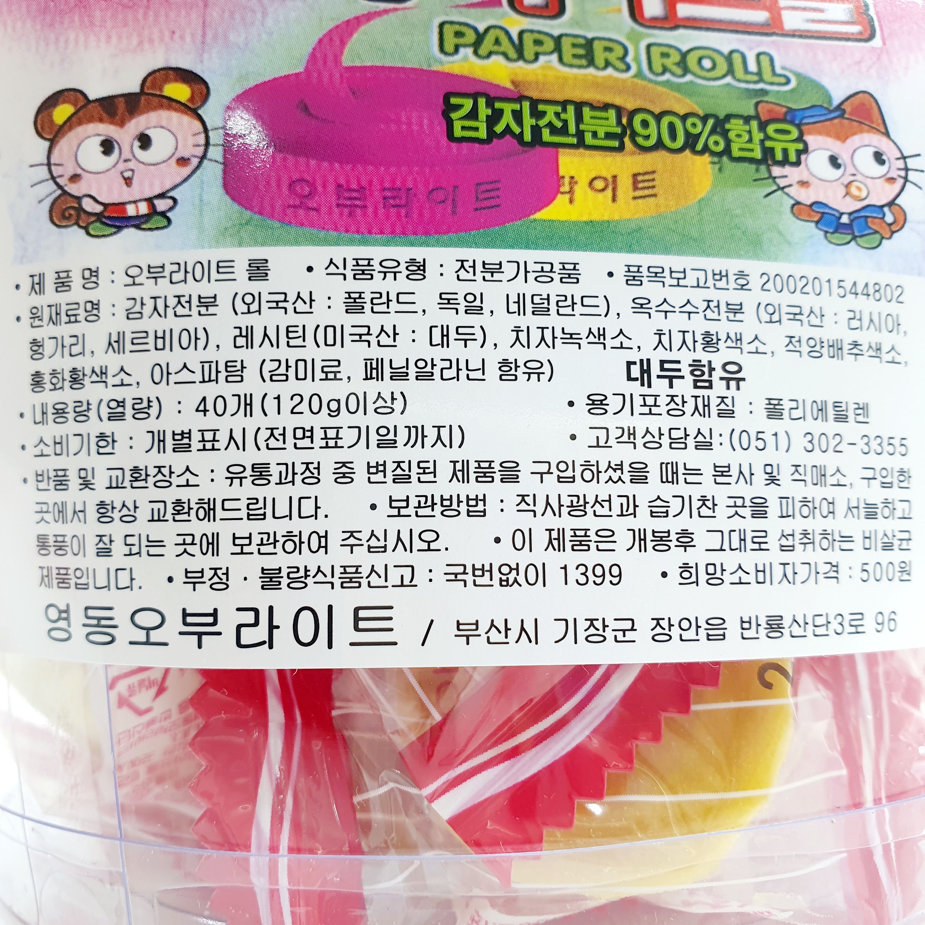원재료명: 감자전분 (외국산: 폴란드, 독일, 네덜란드), 옥수수전분 (외국산: 러시아, 헝가리, 세르비아), 레시틴(미국산 대두), 치자녹색소, 치자황색소, 적양배추색소,홍화황색소, 아스파탐 (감미료, 페닐알라닌 함유) 대두함유