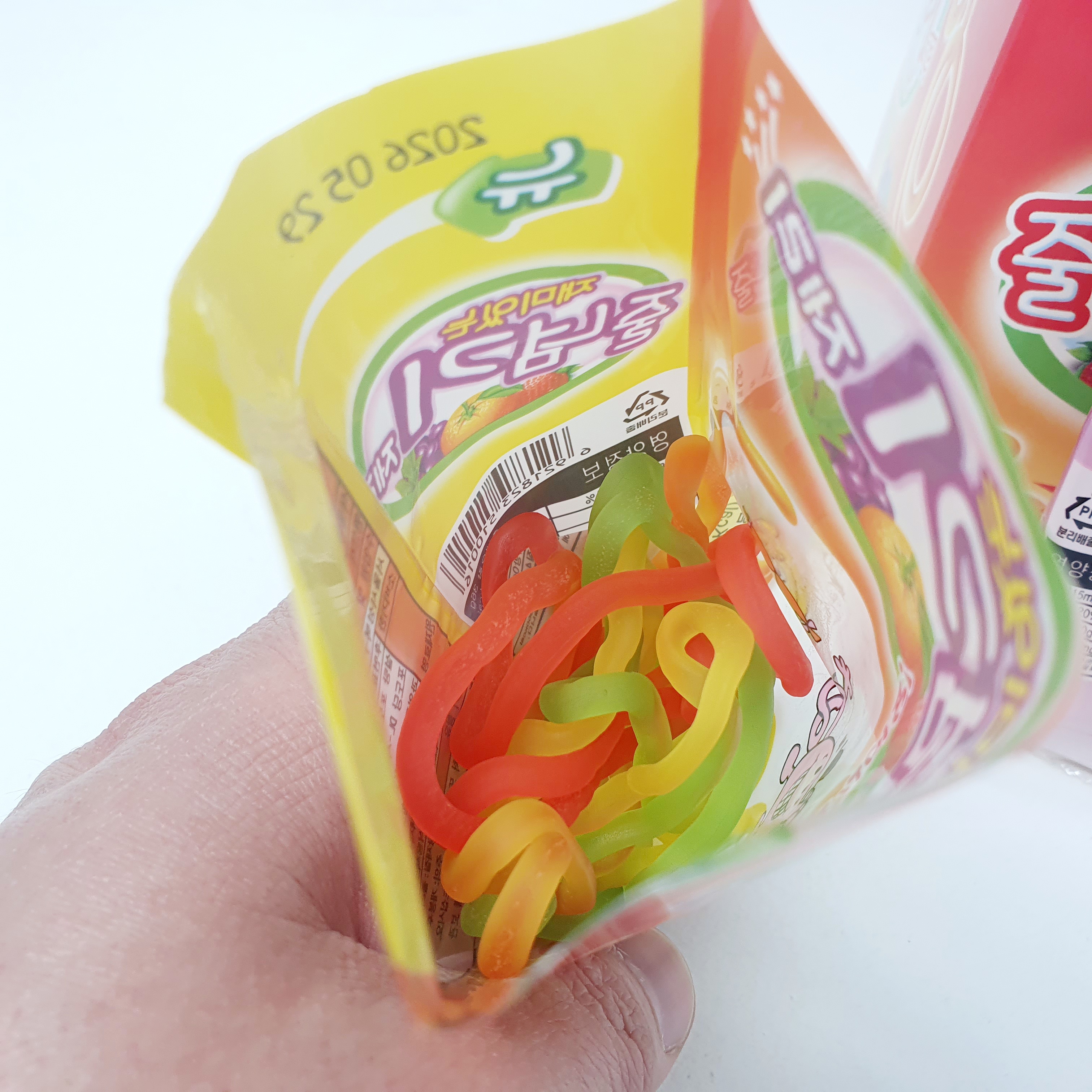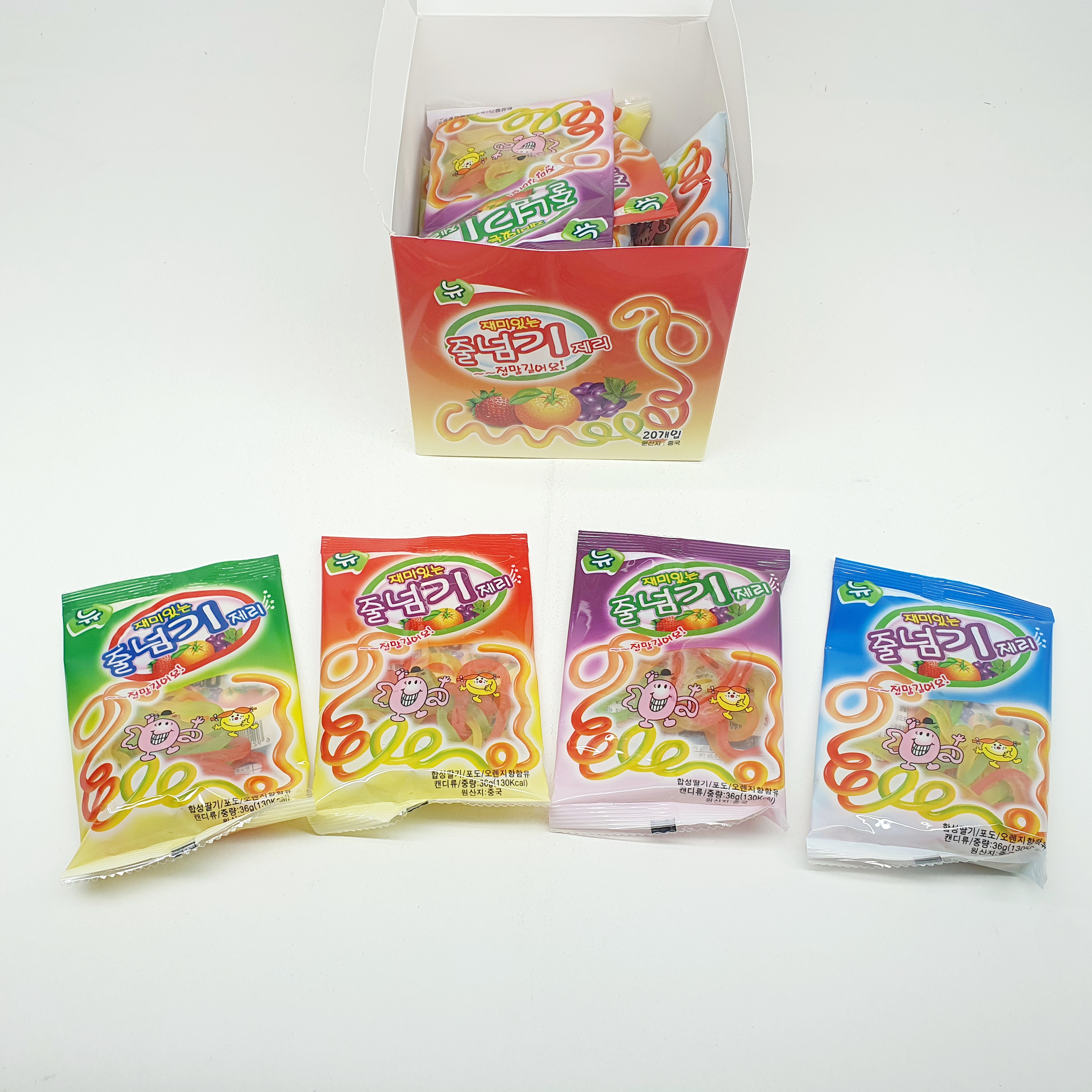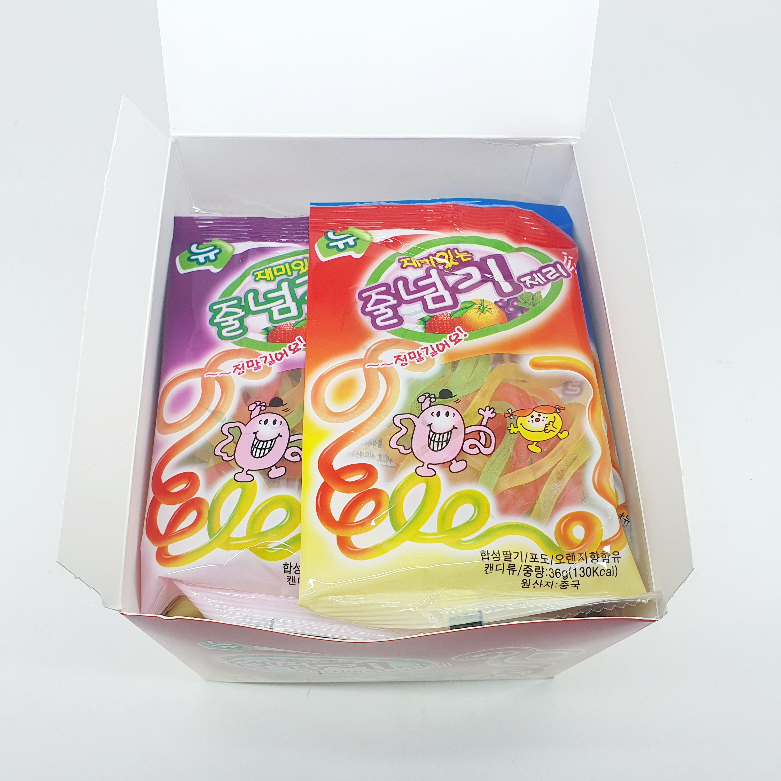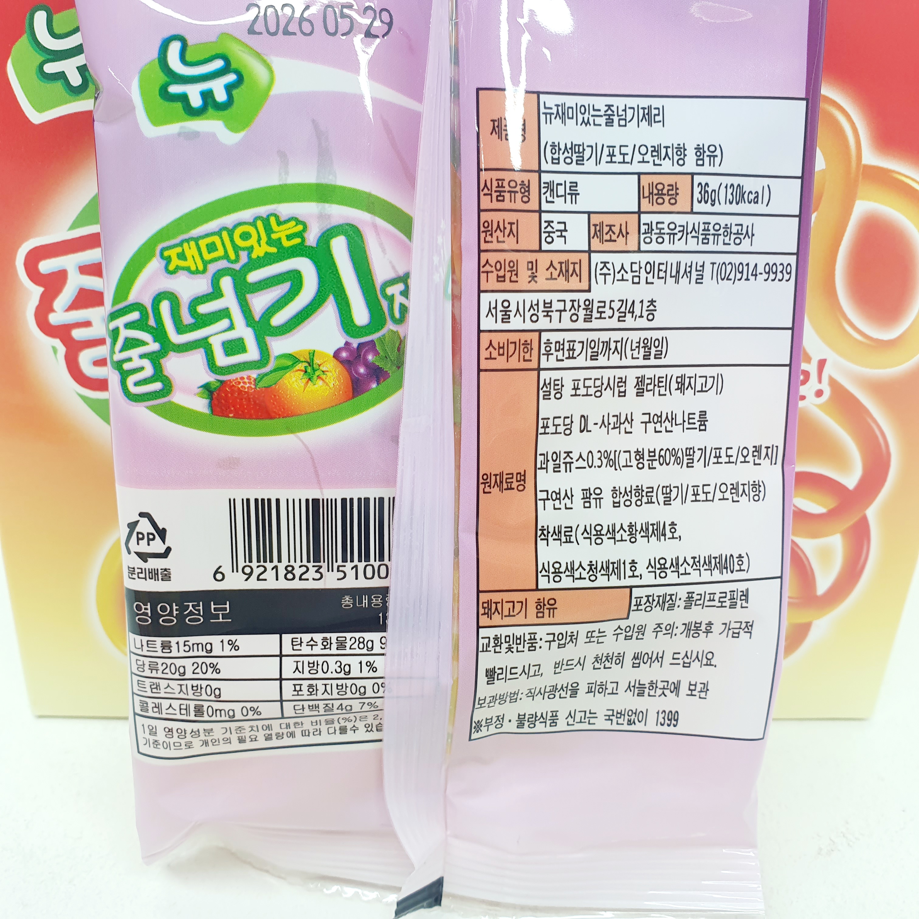 줄넘기란 이름처럼 젤리가 한줄로 끊어지지 않고 줄넘기 크기만큼 길게 이어져있는 재미난 상품입니다.