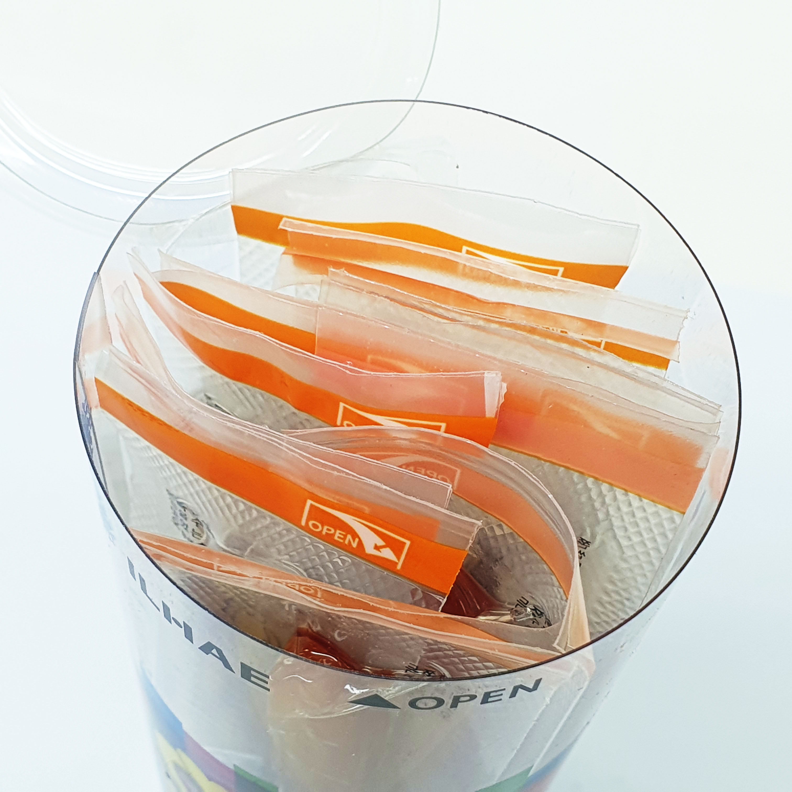둥근 플라스틱 원통형 용기에 10개의 비닐팩 포장 스틱이 들어있어요.
