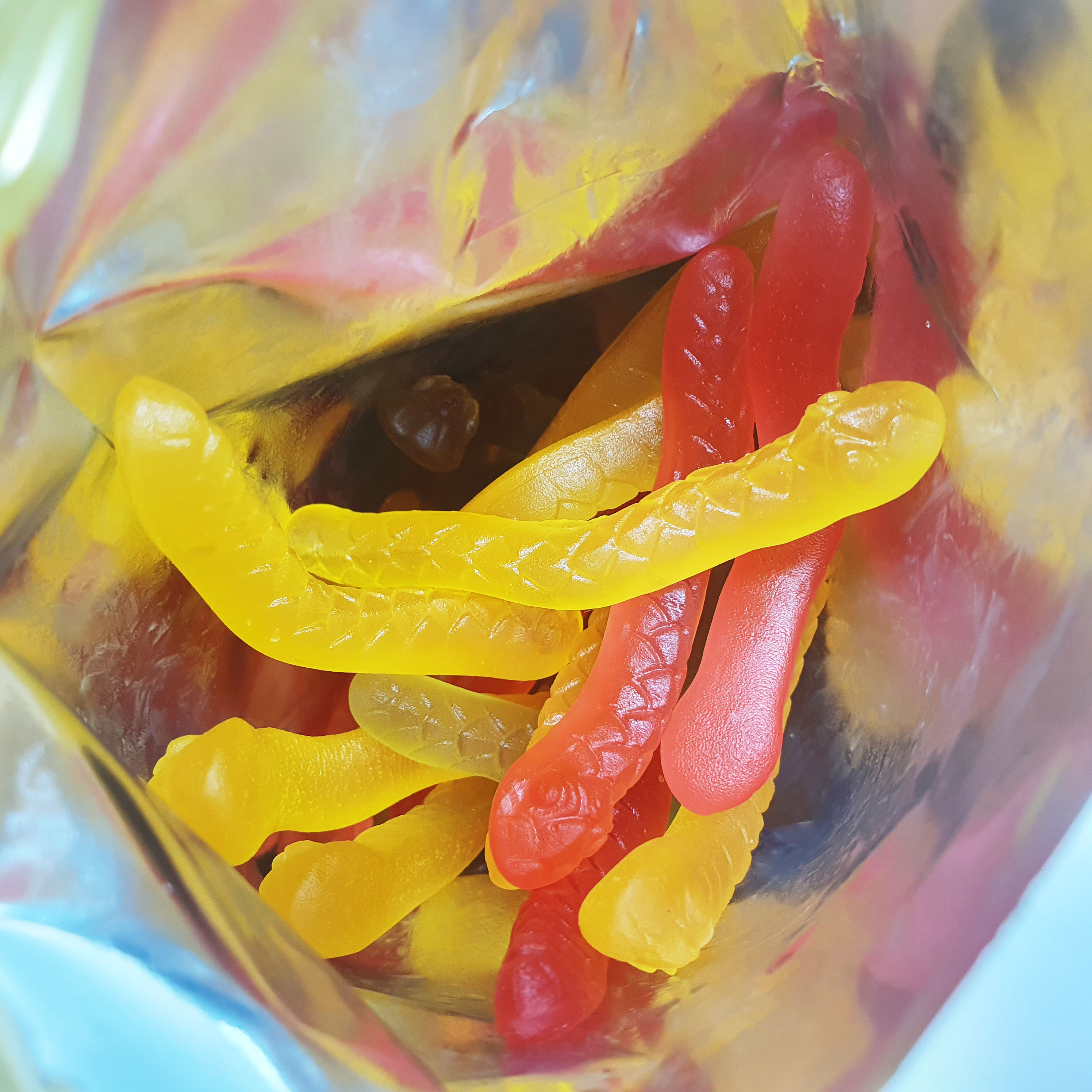 내용물을 열어보면 빨강, 노랑, 연두색의 세 가지 색상 뱀 젤리가 들어있는데,