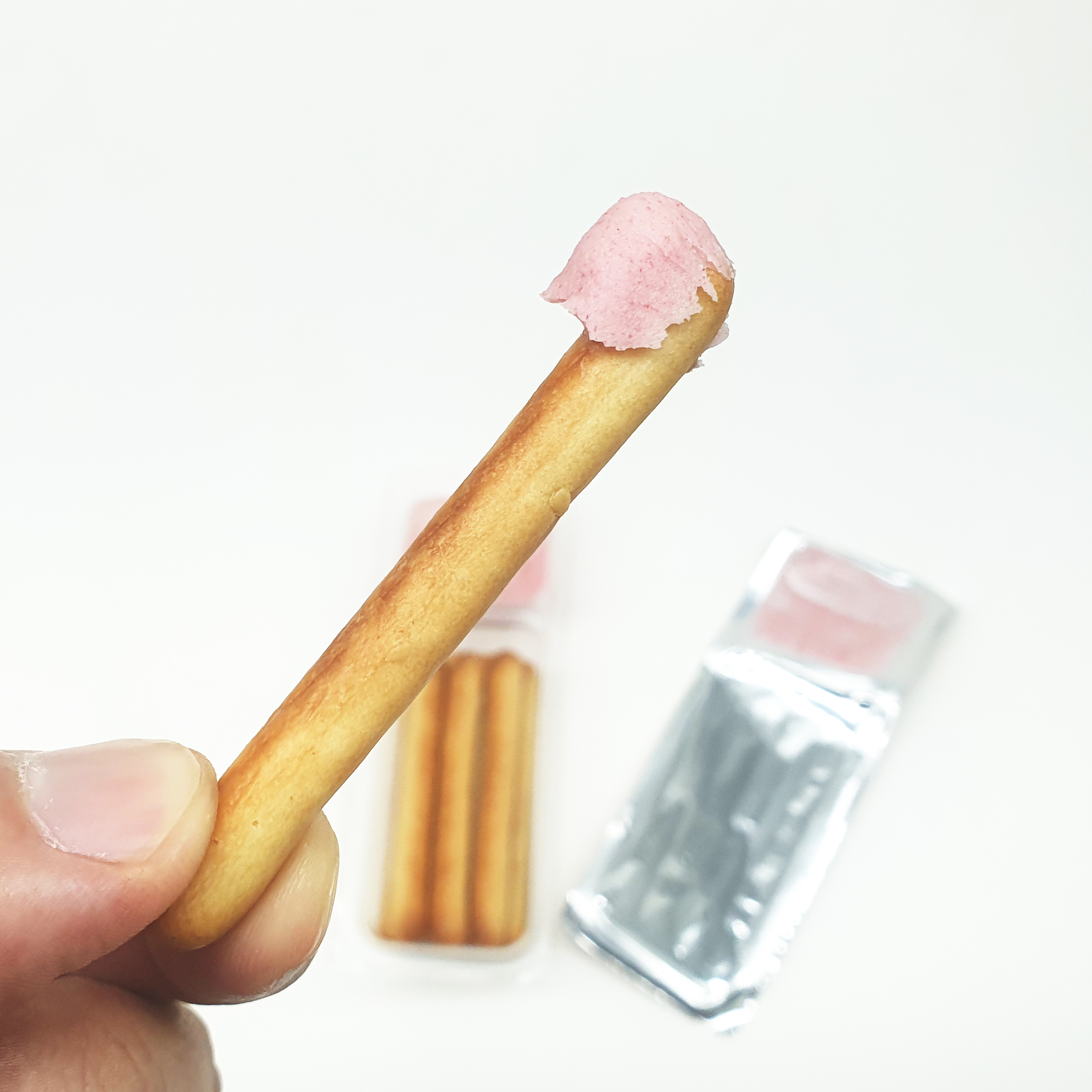 비스킷 스틱에 딸기 크림을 찍어 먹는 방식이라 단순히 과자를 먹는 게 아니라 놀이처럼 즐길 수 있는 간식이에요.