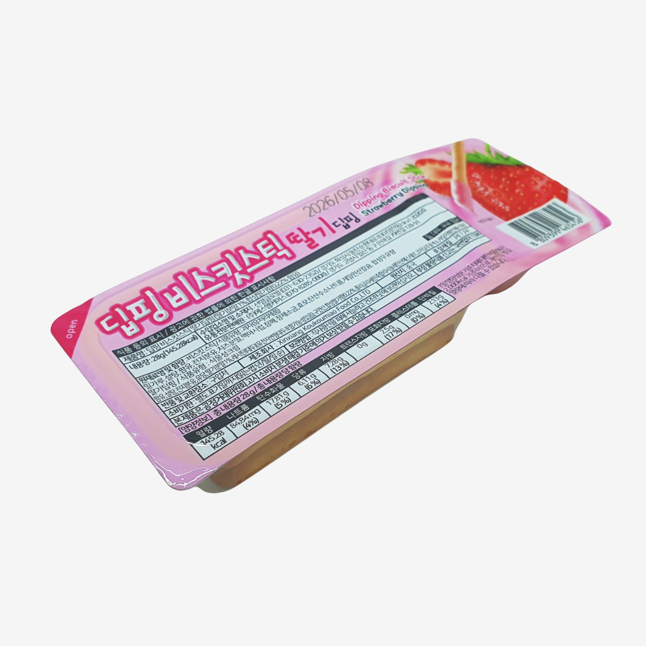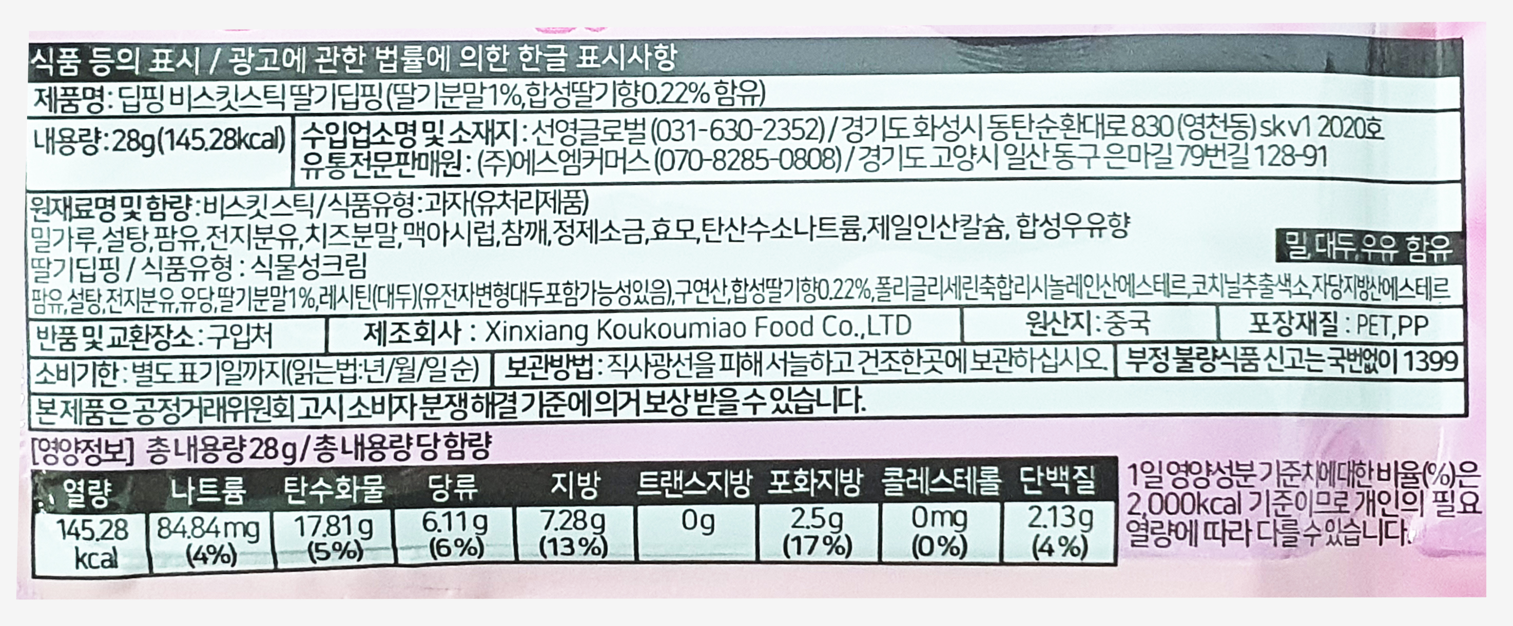 - 제품명: 딥핑 비스킷스틱 딸기딥핑 (딸기분말 1%, 합성딸기향 0.22% 함유)