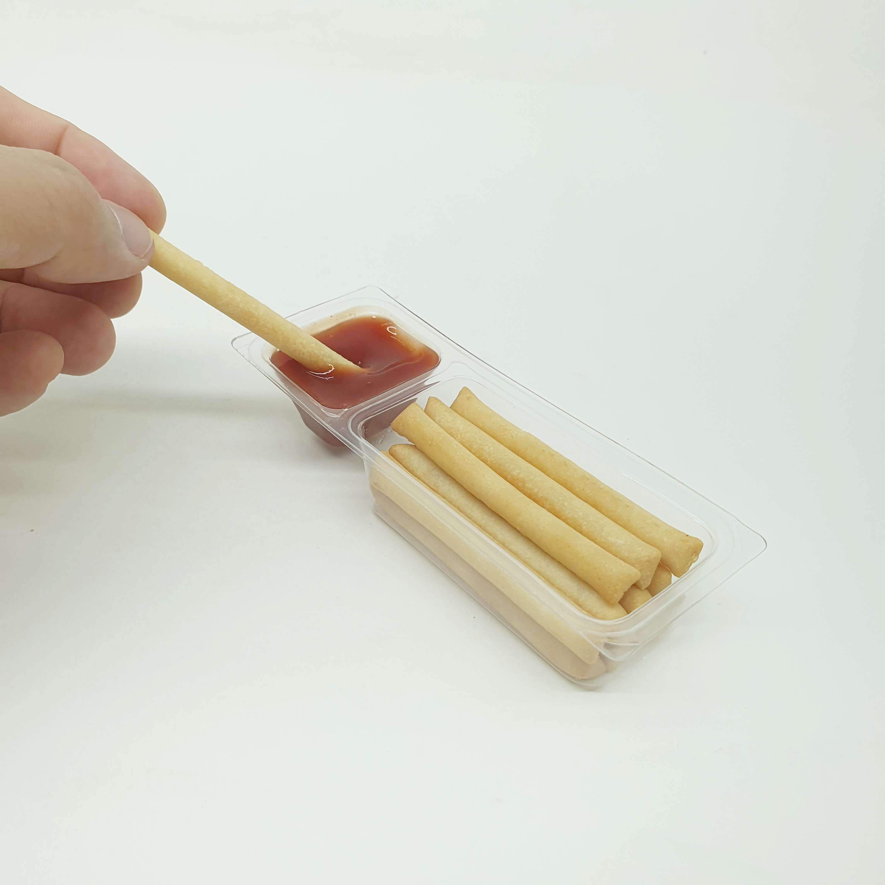 안에는 총 20개 개별 포장이 들어있고, 각각의 포장 안에는 스틱형 감자과자 + 플라스틱 용기에 담긴 케찹 소스가 따로 들어 있어요.