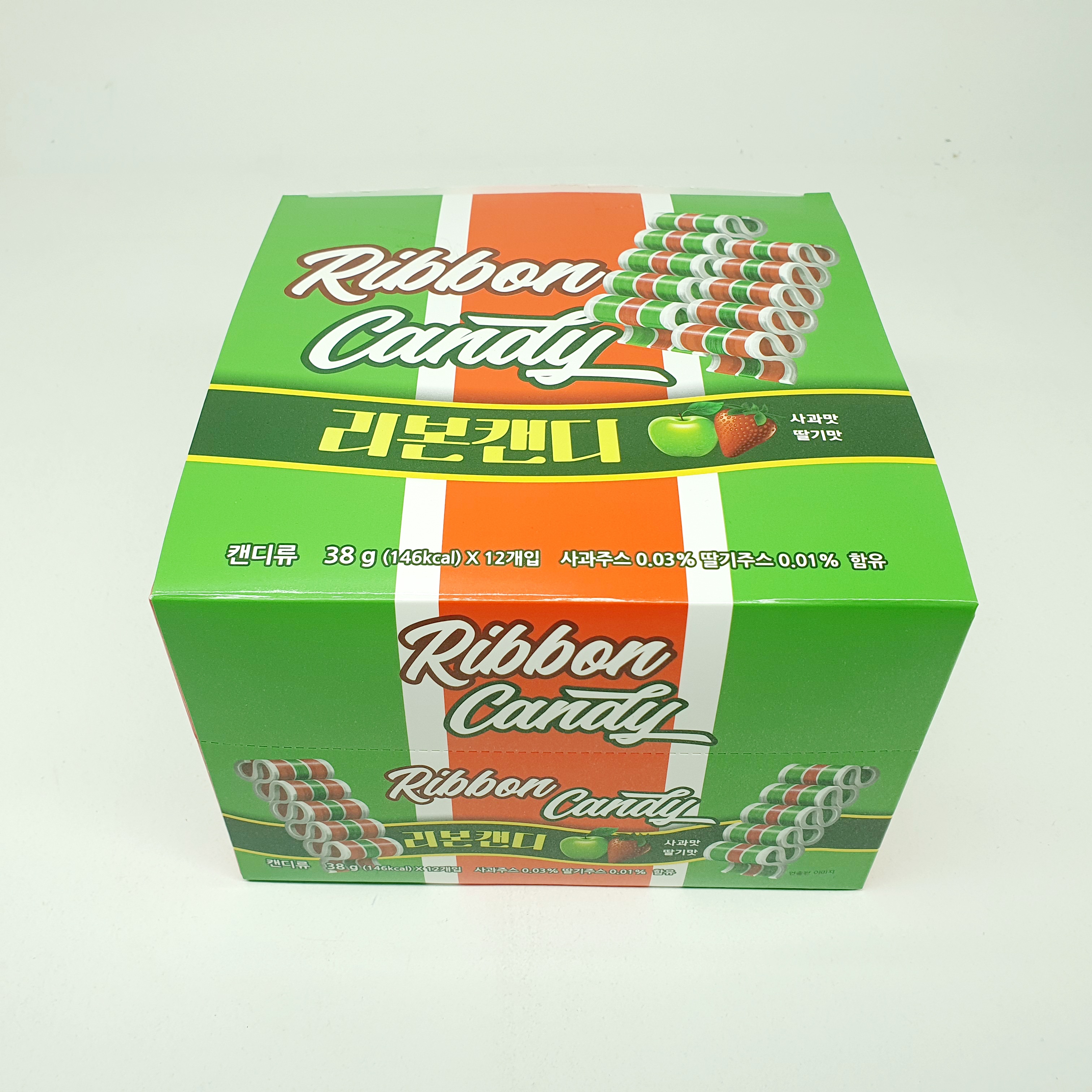 상자안에는 38g의 캔디가 딸기맛 6개+사과맛 6개 총 12개가 들어있어요.