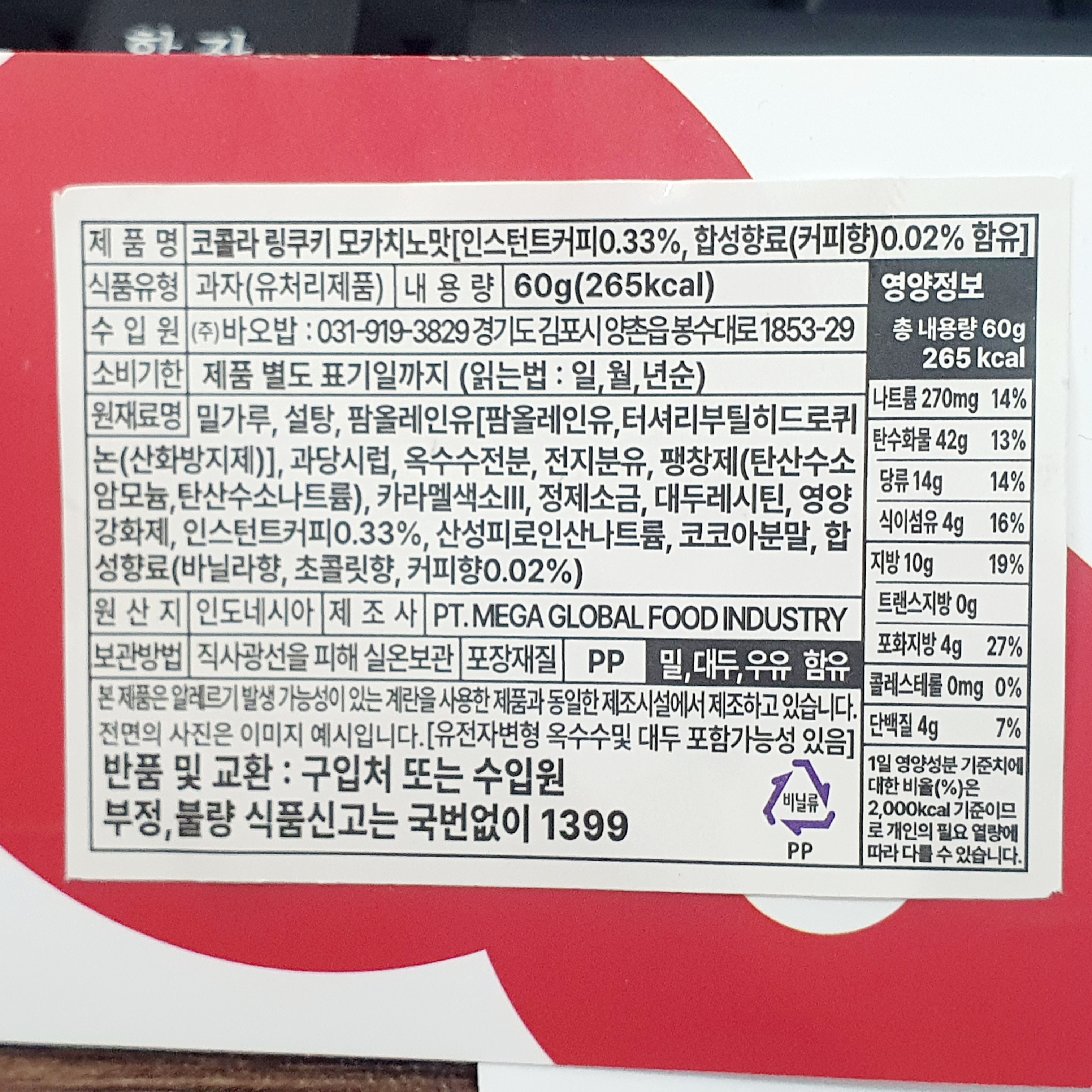 - 제품명: 코콜라 링쿠키 모카치노맛