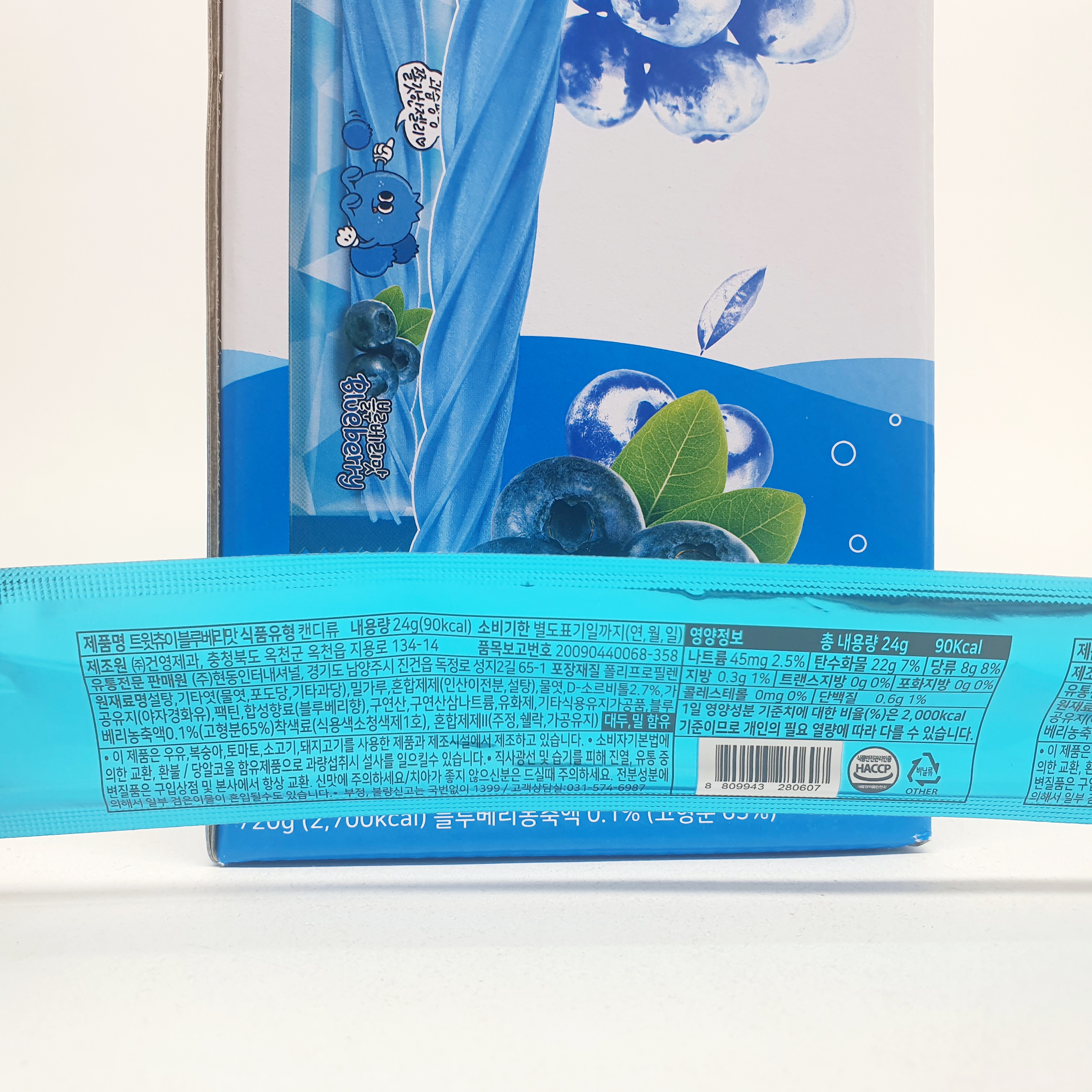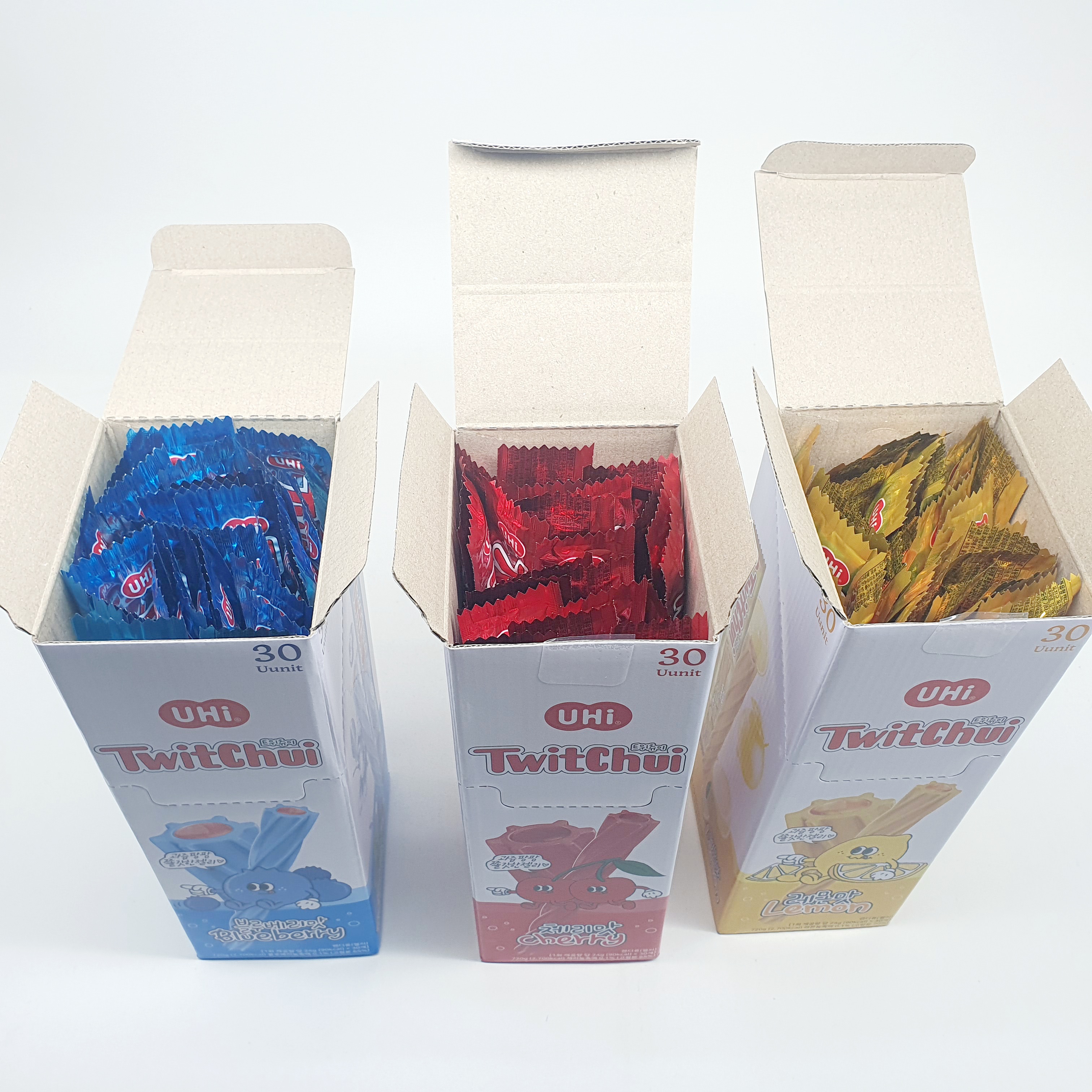트윗츄이 젤리는 블루베리, 체리, 레몬 3가지 맛이 있어요. 한박스에 24g의 젤리가 30개씩 들어 있답니다.